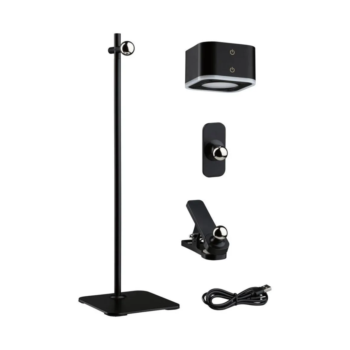 Den mobile bordlampen Varia i sort er den perfekte belysningsløsningen for innendørs bruk og en ekte problemløser. Denne oppladbare USB-C batterilampen kan brukes på en rekke måter, enten som bord, vegg eller bærbar håndlampe. Inkludert i leveringen er et solid bordstativ, et selvklebende veggfeste og et fleksibelt klemmefeste, som alle sørger for enkel håndtering. Takket være de magnetiske kulehodeleddene på holderne kan lyshodet enkelt roteres eller fjernes. Lyseffekten til lampen kan skiftes og styres separat oppover og nedover. Downlighten kan dimmes og den hvite lyskontrollen tilbyr forskjellige fargetemperaturer (2700/4000/6500 K) å velge mellom etter behov. Det varmhvite 2700K lyset i uplighten kan dimmes og gir dermed flott bakgrunnsbelysning eller kan brukes som indirekte lys. Minnefunksjonen lar lyset huske den siste innstillingen når den slås på igjen. Den korte ladetiden og den lange belysningsvarigheten gjør dette fleksible lyset ekstremt praktisk og allsidig.