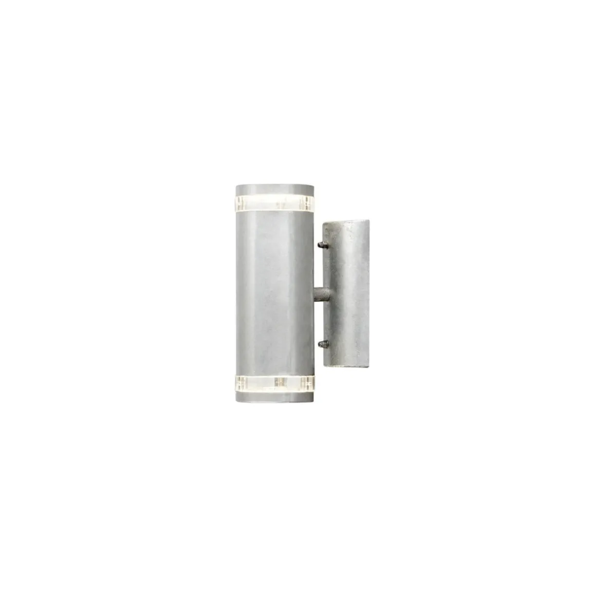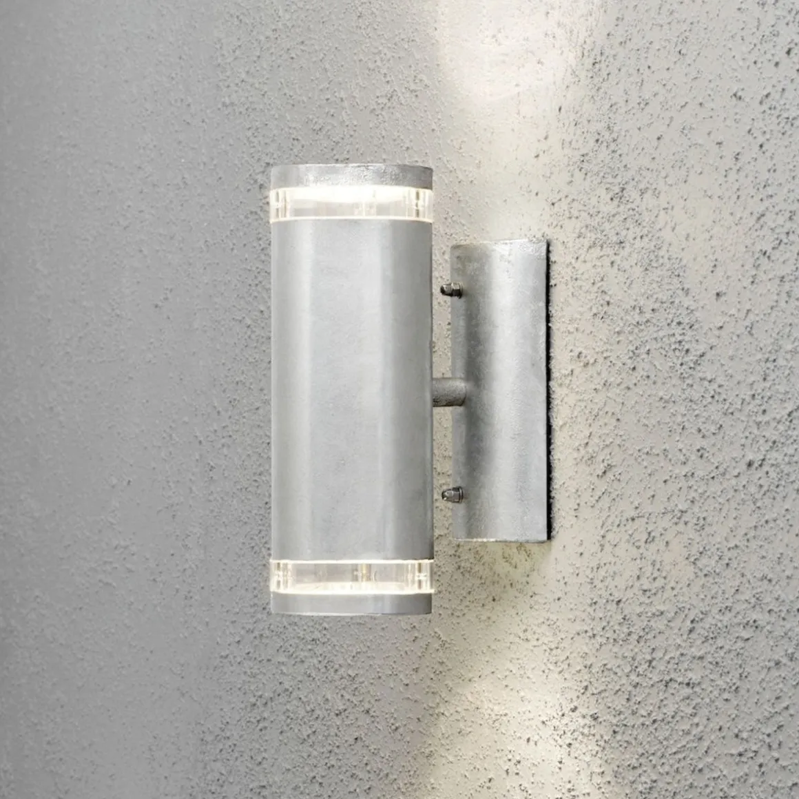 Moderne og dekorativ utelampe som lyser kraftig både opp og ned på veggen. Lampen er en del av en lampe-serie som finnes i flere varianter.