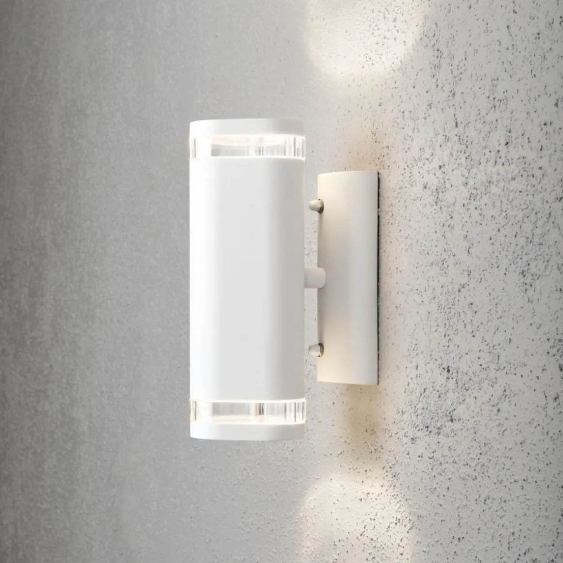 Moderne og dekorativ utelampe som lyser kraftig både opp og ned på veggen. Lampen er en del av en lampe-serie som finnes i flere varianter.