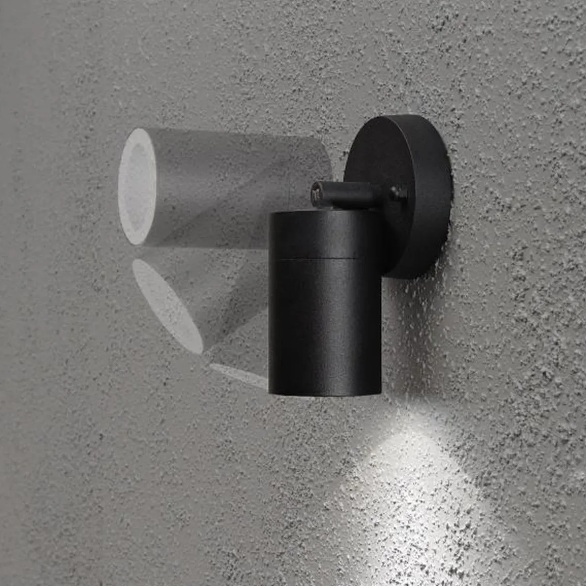 Svart moderne vegglampe som vender ned med dekorativ skjerm og lampehus i glass.