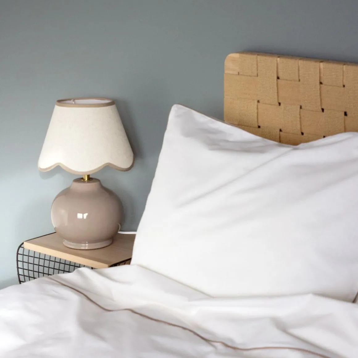 Nell bordlampe er en komplett lampefot med tilhørende skjerm. Den har en kuleformet lampefot i keramikk og en linlignende skjerm med bølget kant og matchende kantbånd. Lampens totale høyde er 35 cm, og den måler 23 cm i bredde og dybde.