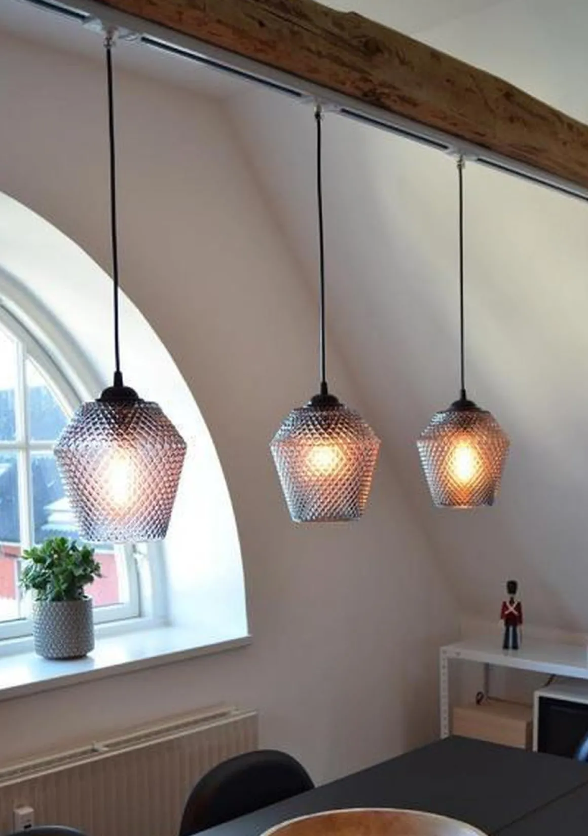 Du kan få Nobb pendlerne i både røykfarget og klart glass med sort oppheng samt sort ledning.