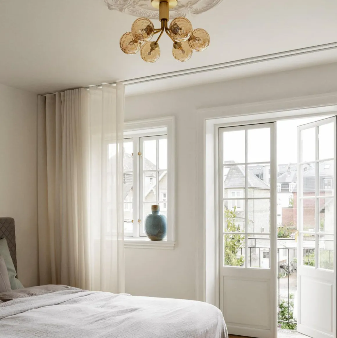Med inspirasjon fra blomster bretter Apiales 6 Ceiling ut sine 6 metallarmer i børstet messing som blomsterstilker fra en spesialprodusert baldakin og støtter 6 munnblåste glasskuler i optic gold.