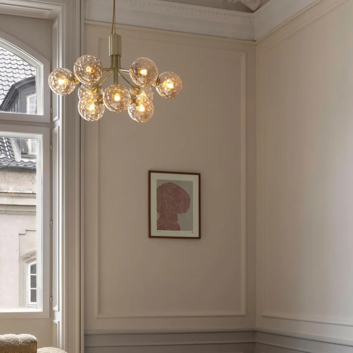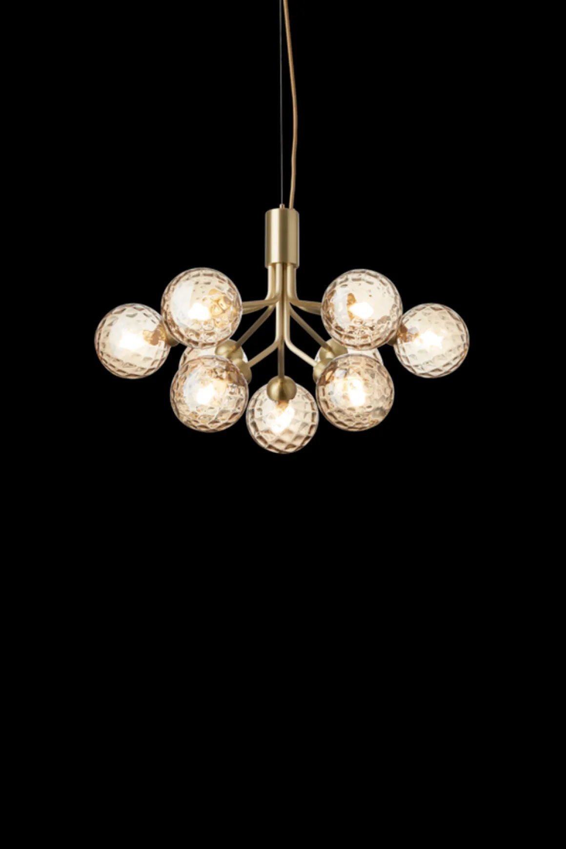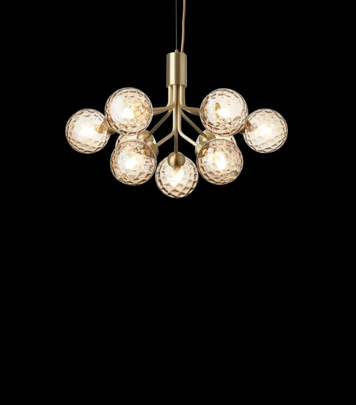 Inspirert av blomster har Sofie Refer designet Apiales-kolleksjonen. Samlingen består av to lysekroner med 9 eller 18 munnblåste glassbolter og er tilgjengelig i gylden Brush Brass-finish eller den glatte Satin Black. Armene på Apiales lysekrone minner om blomsterstilker som sprer et diffust og vakkert lys.