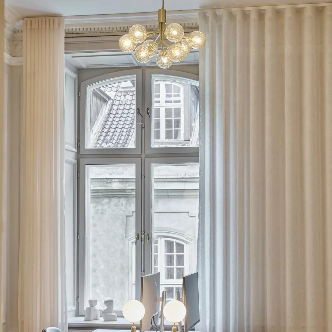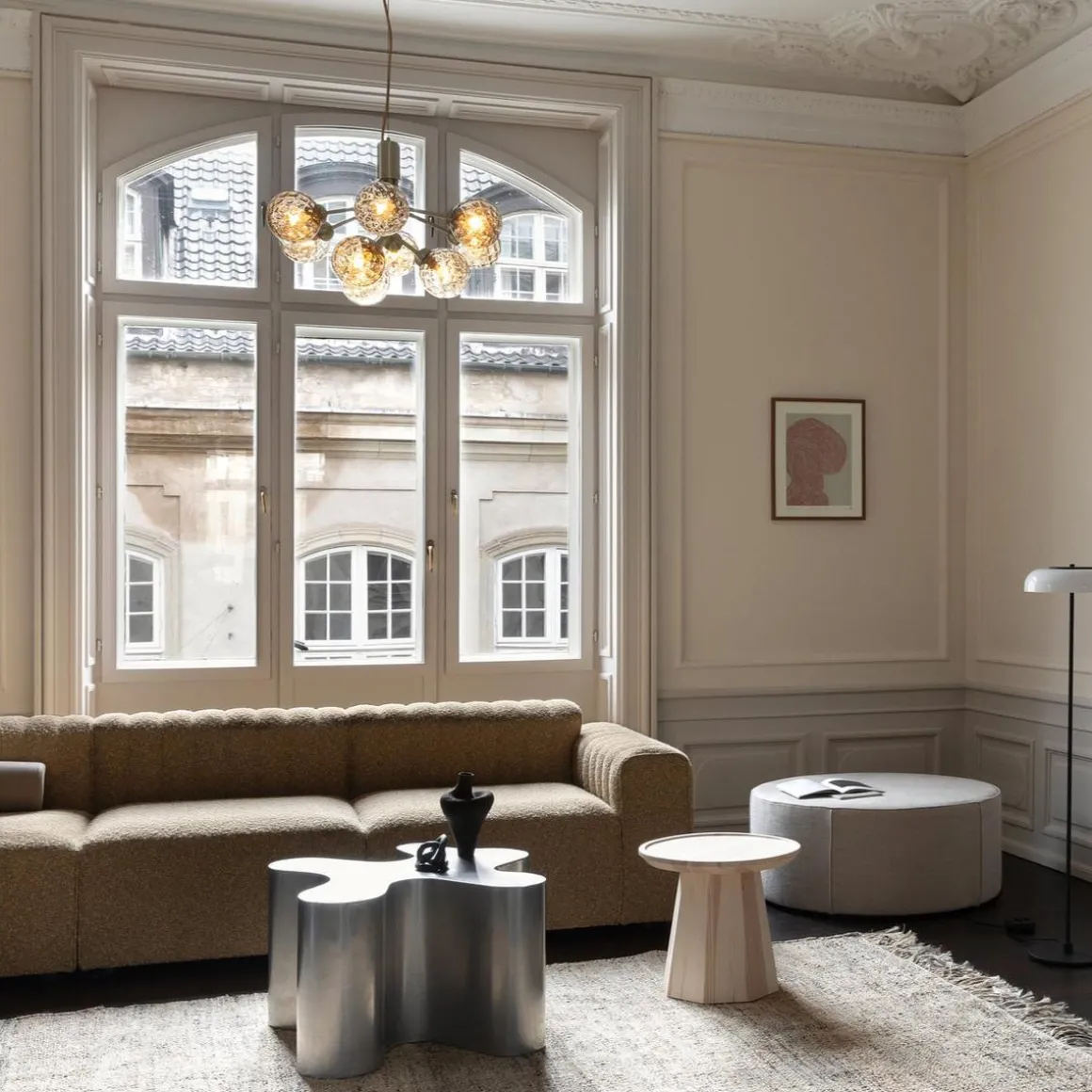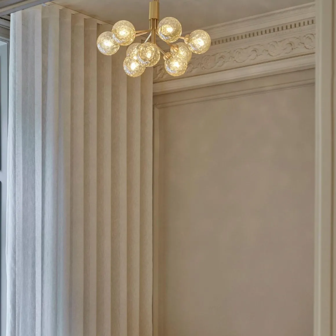 Inspirert av blomster har Sofie Refer designet Apiales-kolleksjonen. Samlingen består av to lysekroner med 9 eller 18 munnblåste glassbolter og er tilgjengelig i gylden Brush Brass-finish eller den glatte Satin Black. Armene på Apiales lysekrone minner om blomsterstilker som sprer et diffust og vakkert lys.