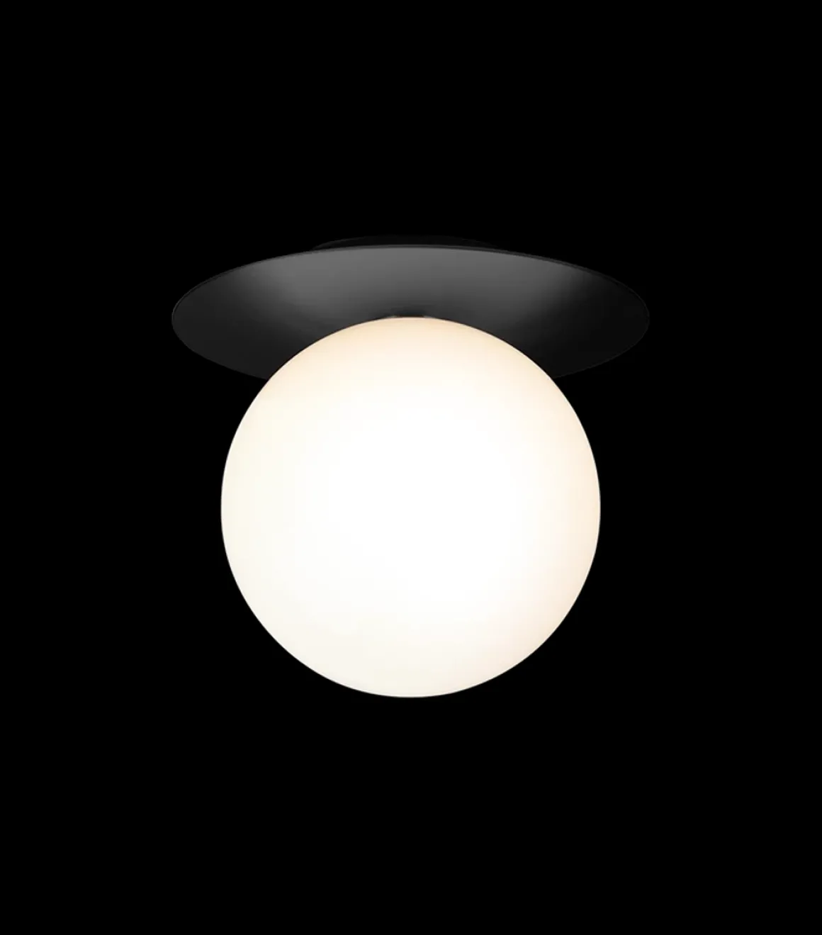 Liila 1 Large er en enkeltlampe som egner seg enten som innfelt taklampe eller som vegglampe, noe som gjør den svært relevant for ulike behov i hjemmet. En tynn metallskive i svart finish dekker basen mens en stor munnblåst glasskule i opalhvitt fungerer som fokuspunktet for denne lampen. Liila 1 Large passer for gang, mindre rom og rom med lav takhøyde, og er godkjent for montering på bad.