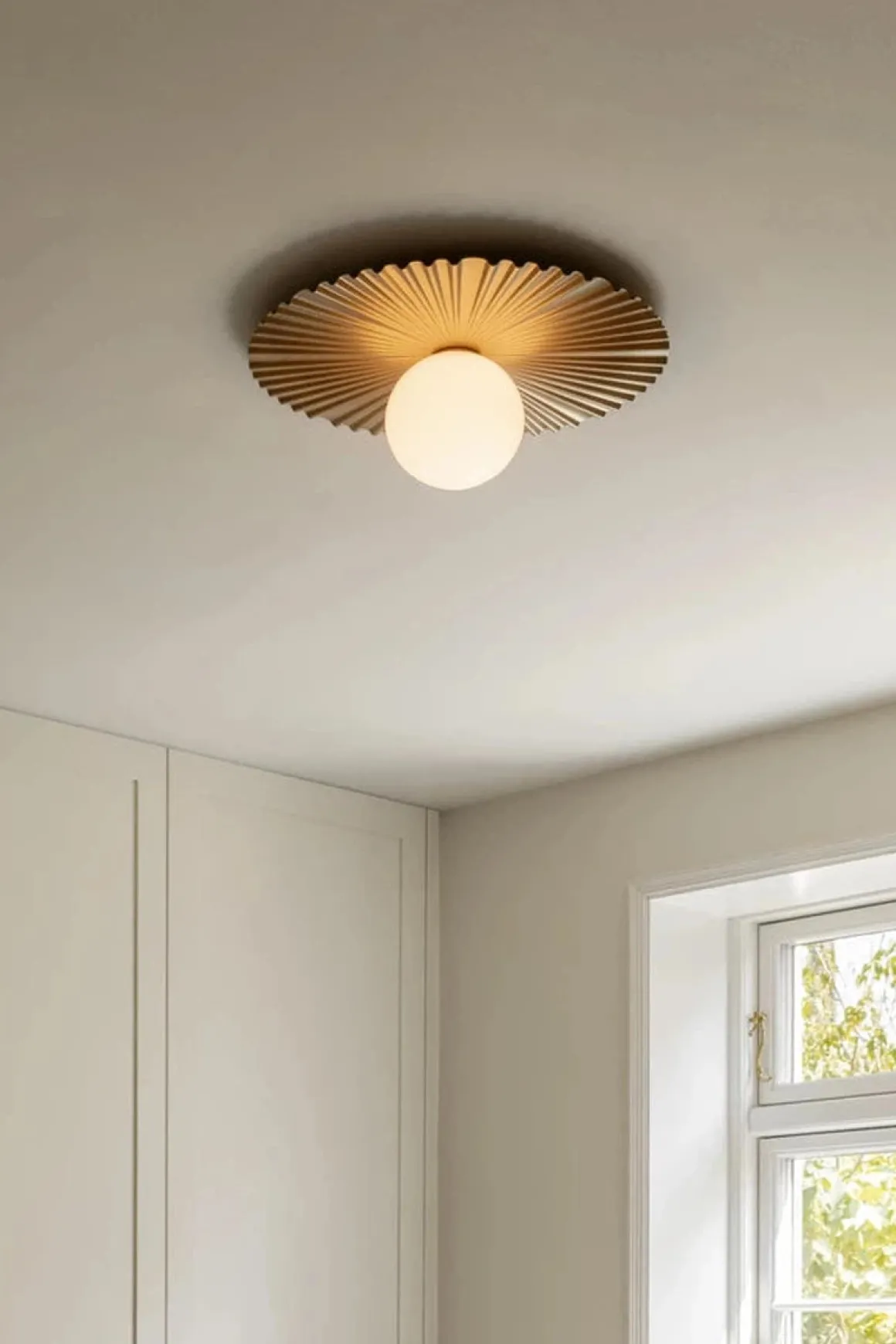 Liila Muuse Medium er et lekent tillegg til Liila-seriens flyteegenskaper. Vegg- og taklampen består av en stor riflet bakplate i gyllent metall og en mindre opalhvit glasskule. Kombinasjonen av den bølgete teksturen og den rene, organiske formen gir dybde og dimensjon, og fremhever de morsomme funksjonene. Liila Muuse Medium-lampen er ideell som en semi-flush-montert taklampe i en foaje, og gir et interessant uttrykk til rommet.