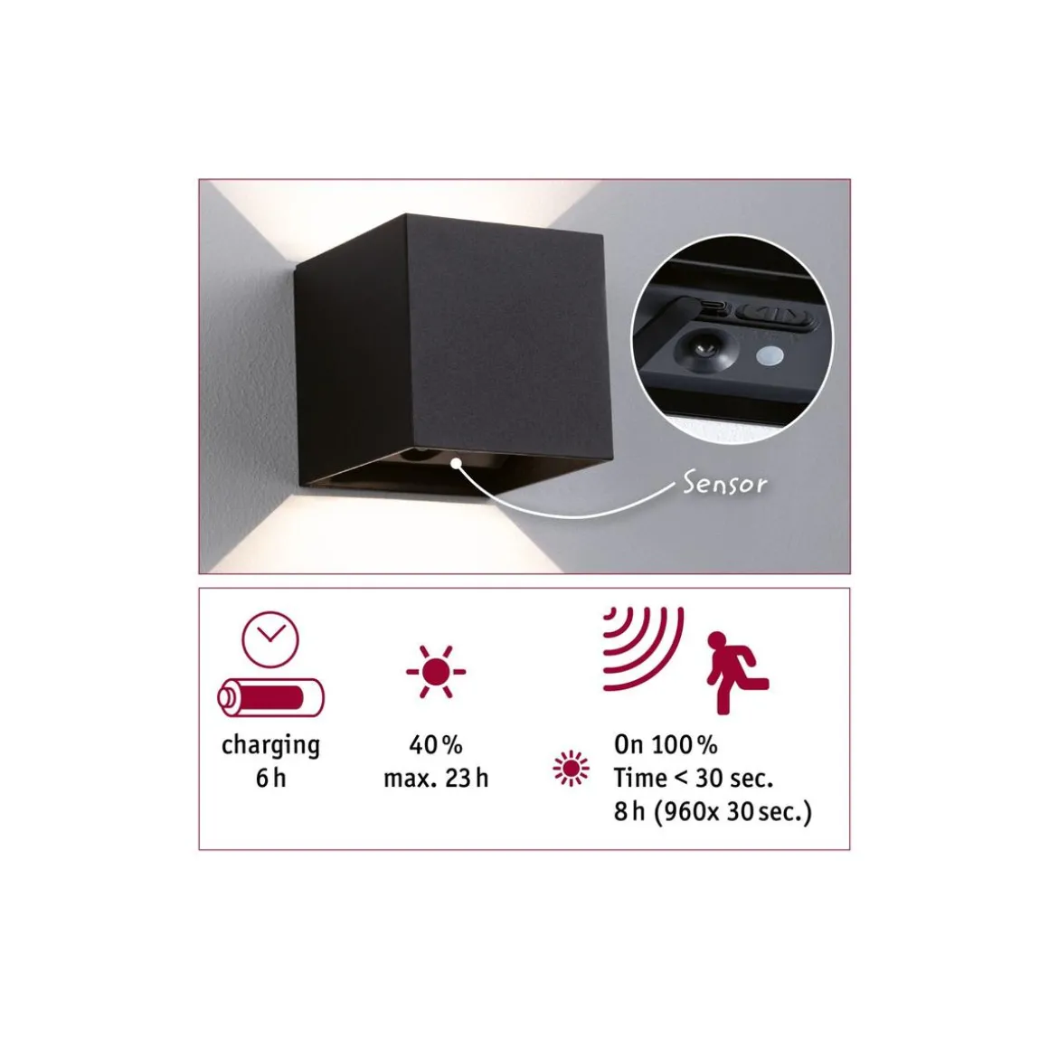 Den oppladbare vegglampen Nyara med integrert bevegelsessensor er et perfekt valg der det er behov for et funksjonelt tilleggs- eller orienteringslys. Siden det ikke er behov for stikkontakt, kan den brukes i stuen, gangen og – takket være IP44-beskyttelsen – til og med på badet, på balkongen eller på en yttervegg. Lampen har tre innstillingsalternativer: På, Av og Auto. Når den er slått på, sender lampen kontinuerlig ut et varmt hvitt lys med 40 % lysstyrke. I Auto-modus aktiveres den skumringsstyrte bevegelsessensoren, og lyset bytter automatisk til 100 % lysstyrke for maksimal komfort og sikkerhet. Lystiden i Auto-modus er rundt 8 timer og 23 timer i På-modus. Lampen deaktiveres etter 30 sekunder hvis det ikke registreres bevegelse eller omgivelseslysstyrken overstiger 30 lux. Den medfølgende USB-C-ladekabelen garanterer rask ladetid for det oppladbare batteriet på 6 timer. Som installasjonshjelp kan den magnetiske bakplaten limes eller boltes til veggen. Dette sikrer at lampen raskt og enkelt kan tas ut for lading.