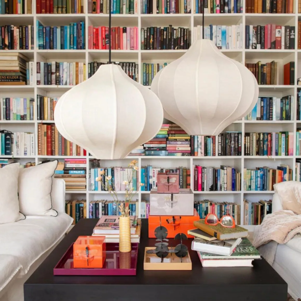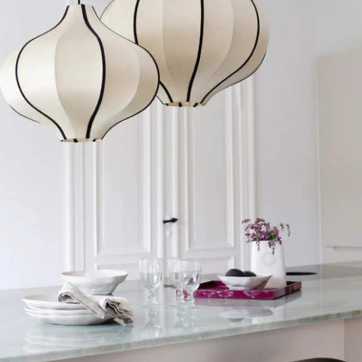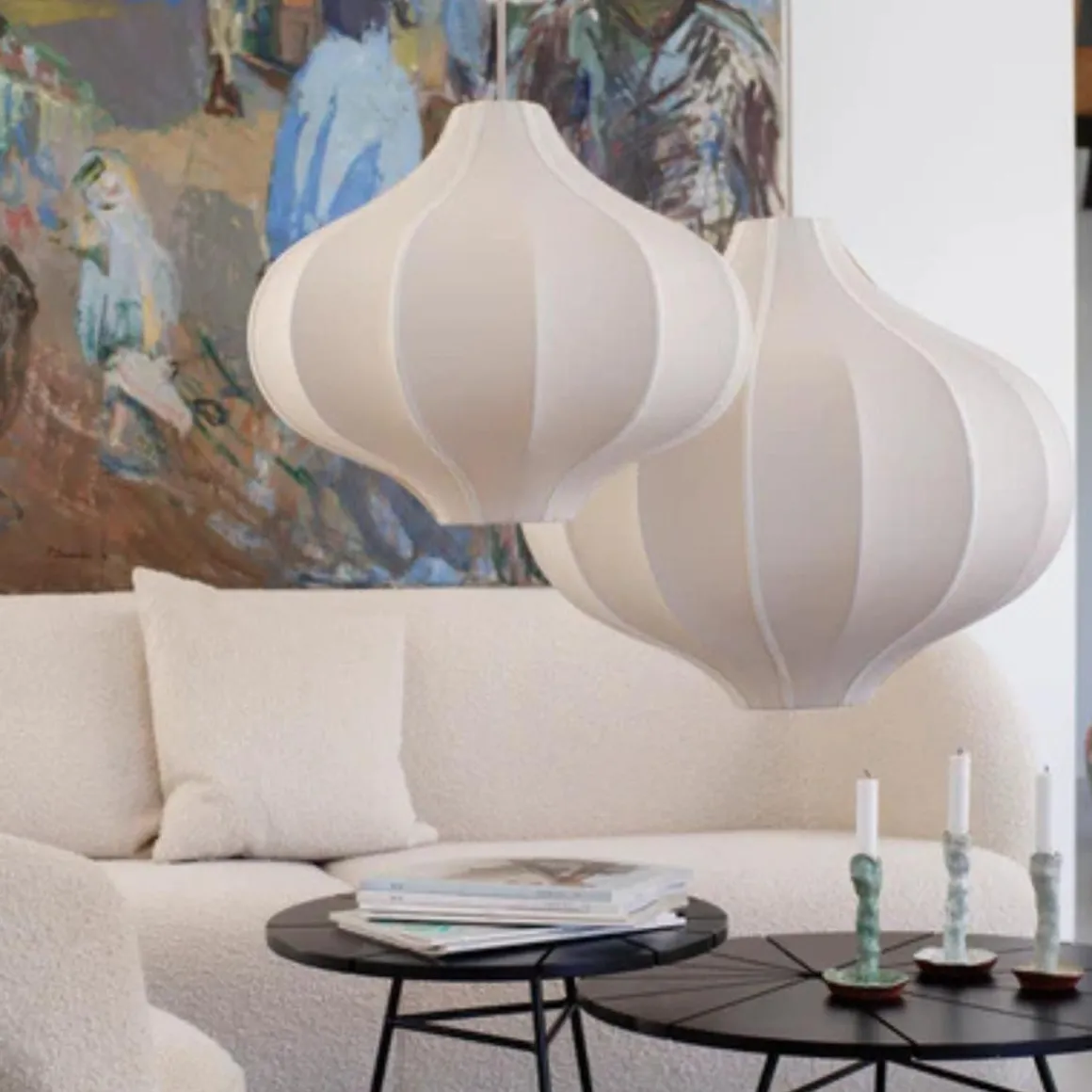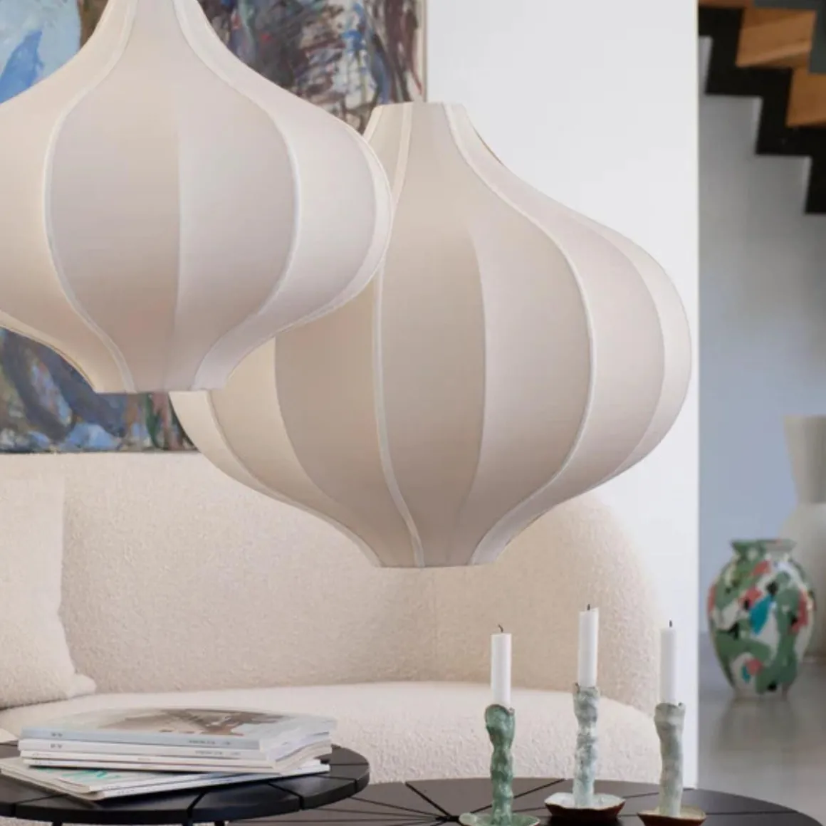 Oi Soi Oi lager noen av de vakreste taklampene vi har sett. Disse silkeskjermen kommer i forskjellige størrelser og fasonger. De henger fint alene og er fine i gruppe av flere.