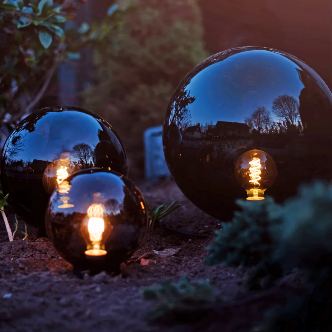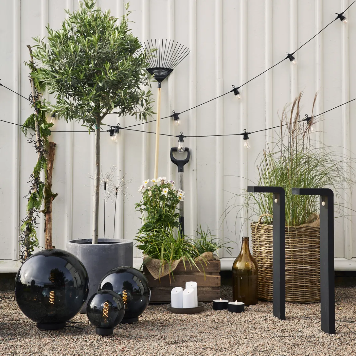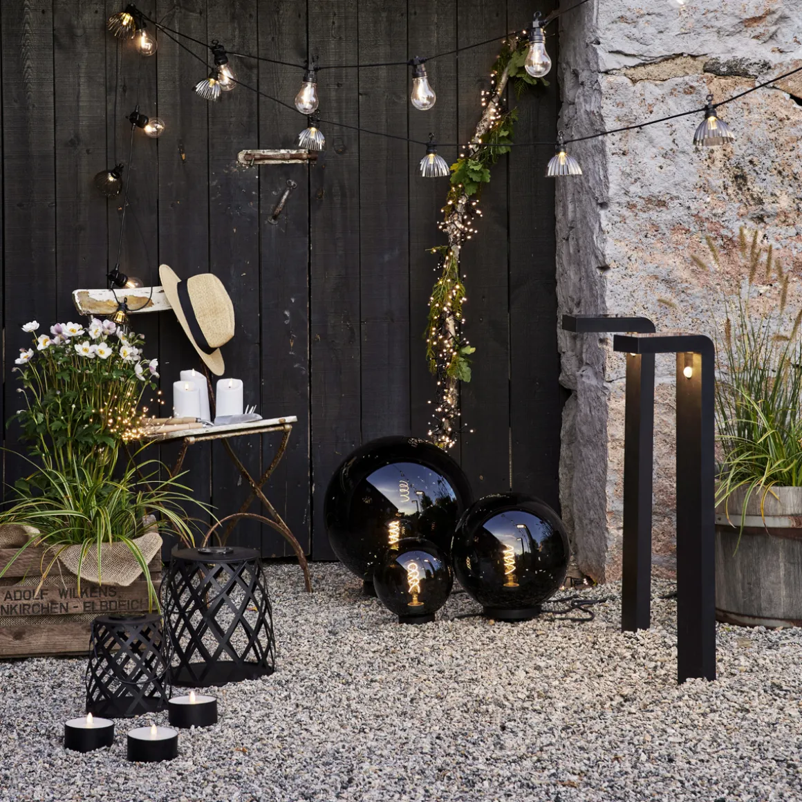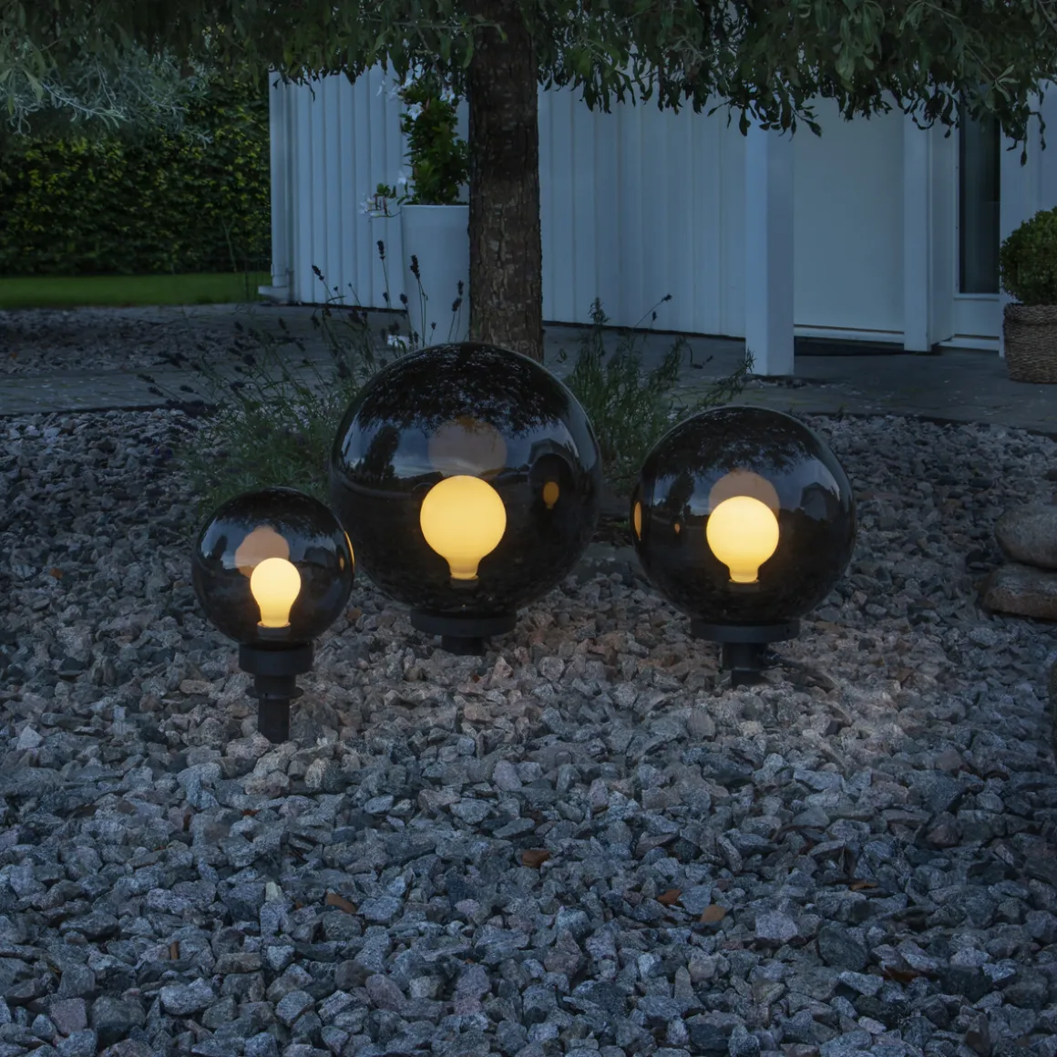 Det følger med jordfeste og vanlig bakkefeste, slik at du kan velge det festet som passer best hos deg. Hagelampen finnes i tre ulike størrelser med diameter 20, 30 og 40 cm. Kombiner gjerne ulike størrelser for å få en ekstra stilig look.