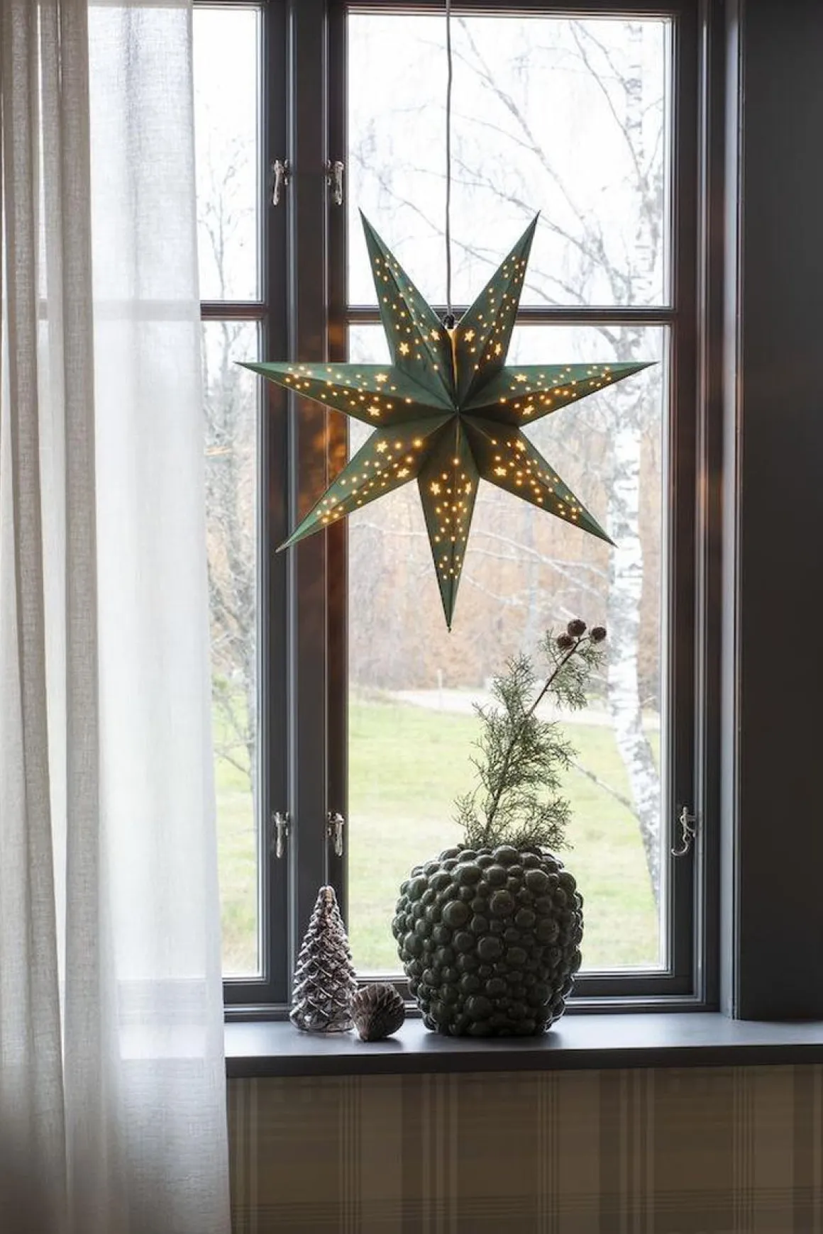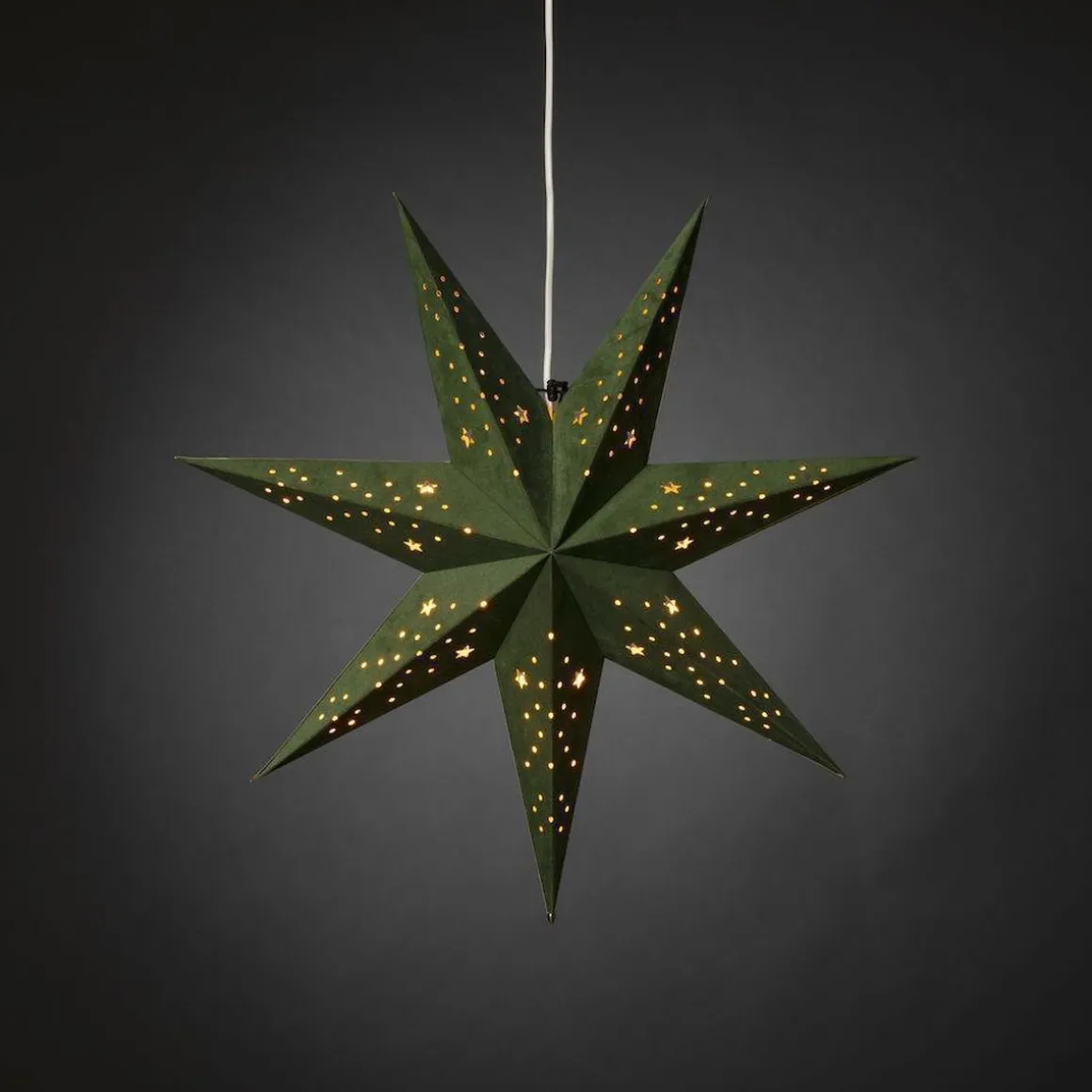 Pappstjerne 60 cm grønn fløyel med gull innside. 7 armet. Inkludert oppheng. E14 lampeholder. Hvit kabel.