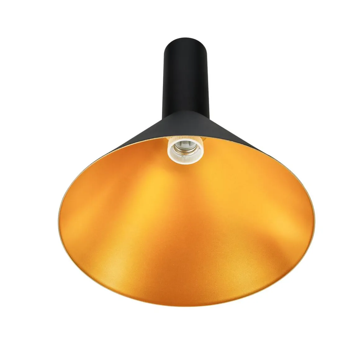 PHELIA er en 230V pendelarmaturserie i kjegleform og kommer i mange ulike varianter. armaturet er i sort/gull og har en rund takrosett. Den integrerte E27-sokkelen gjør armaturet velegnet for LED- og sparelyskilder. armaturets pendellengde er på 200 cm.
