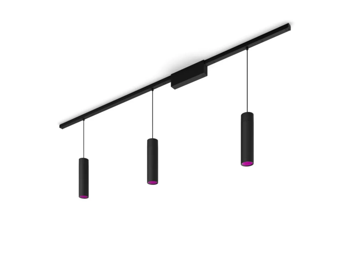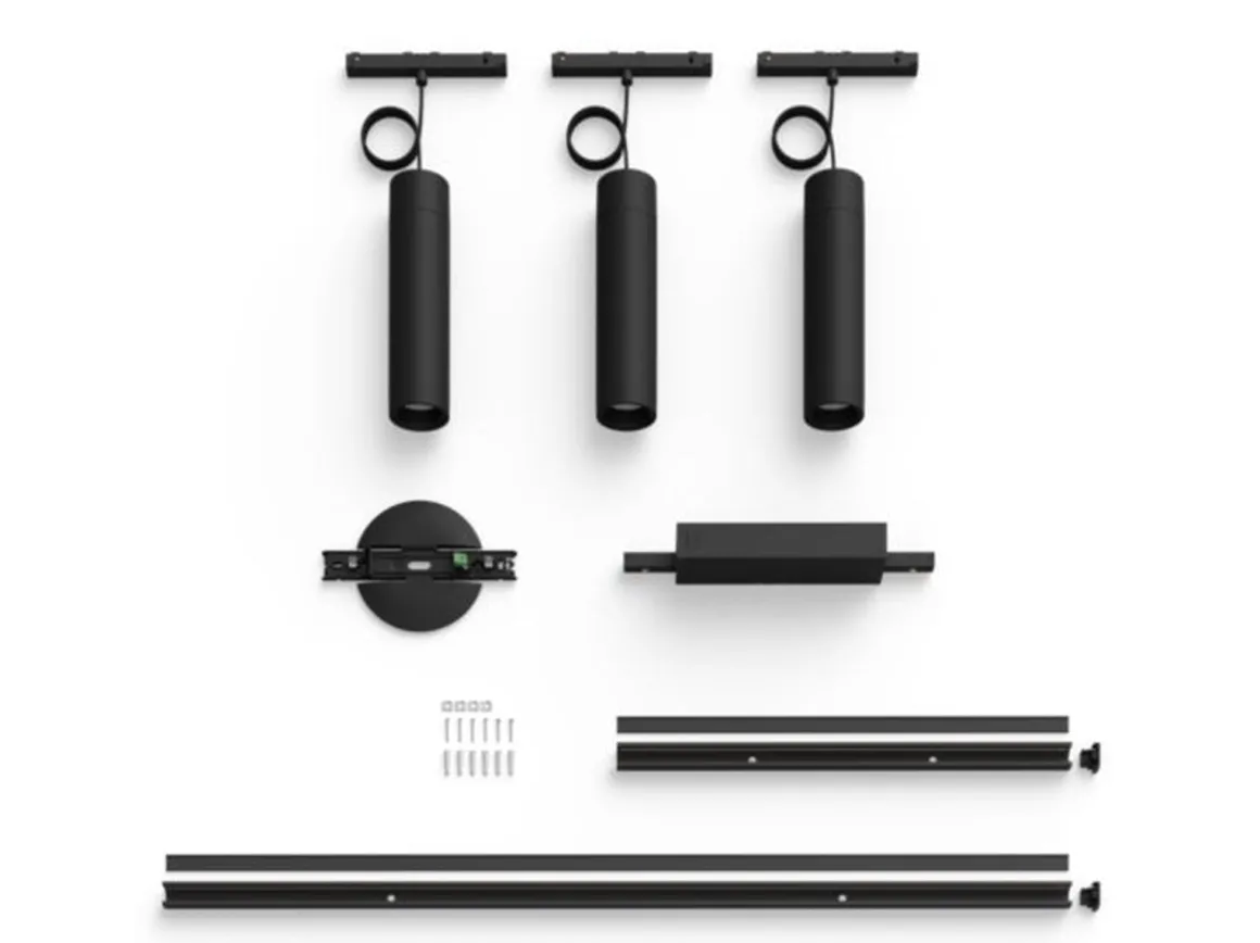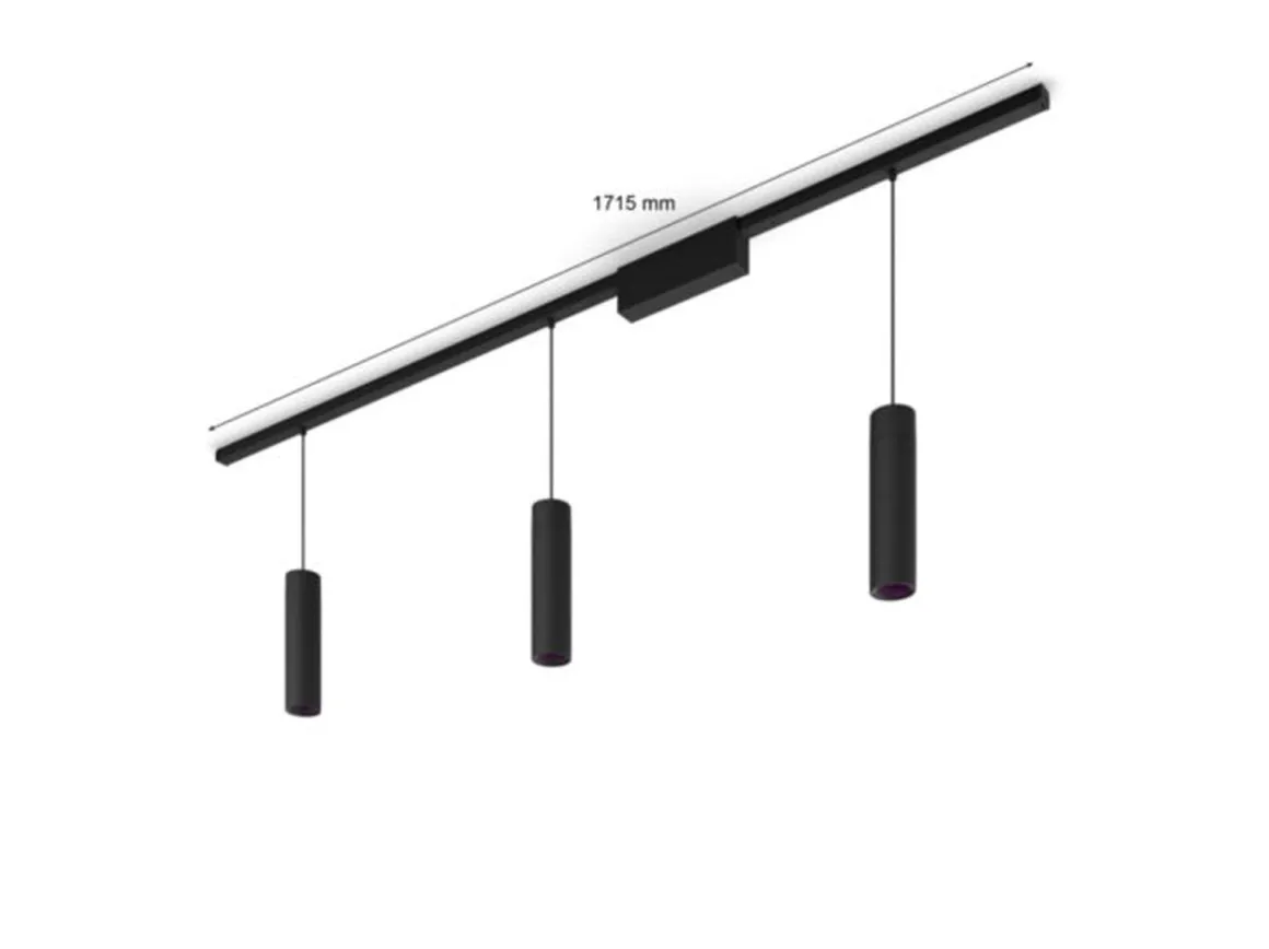 Dette svarte skinnebelysningssettet til tak inkluderer to pendellamper, en 1-meters skinne, en 0,5-meters skinne og en strømforsyning