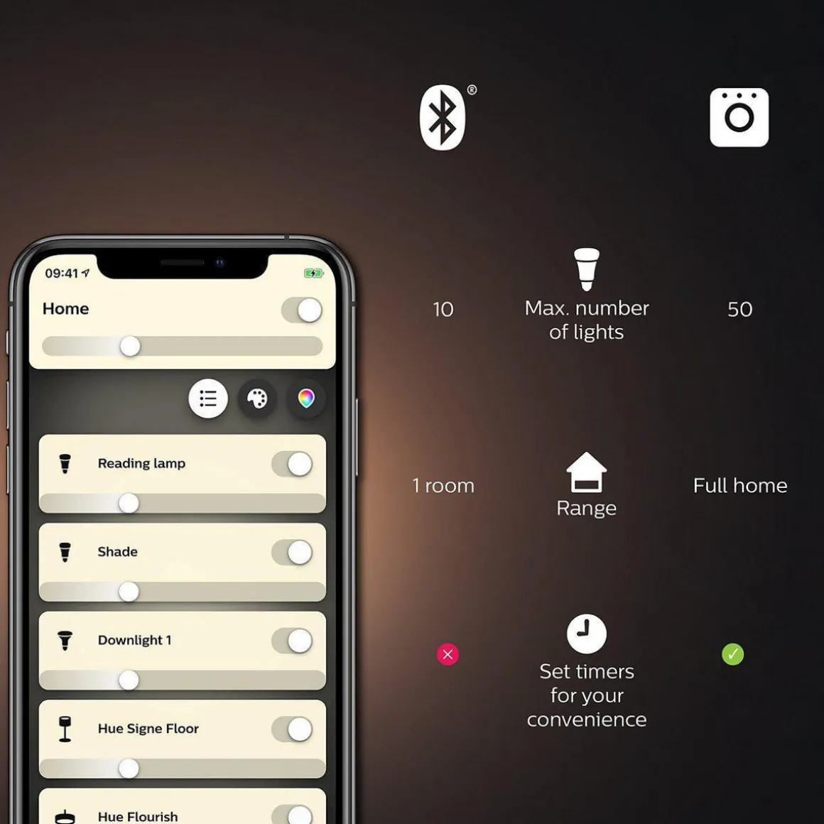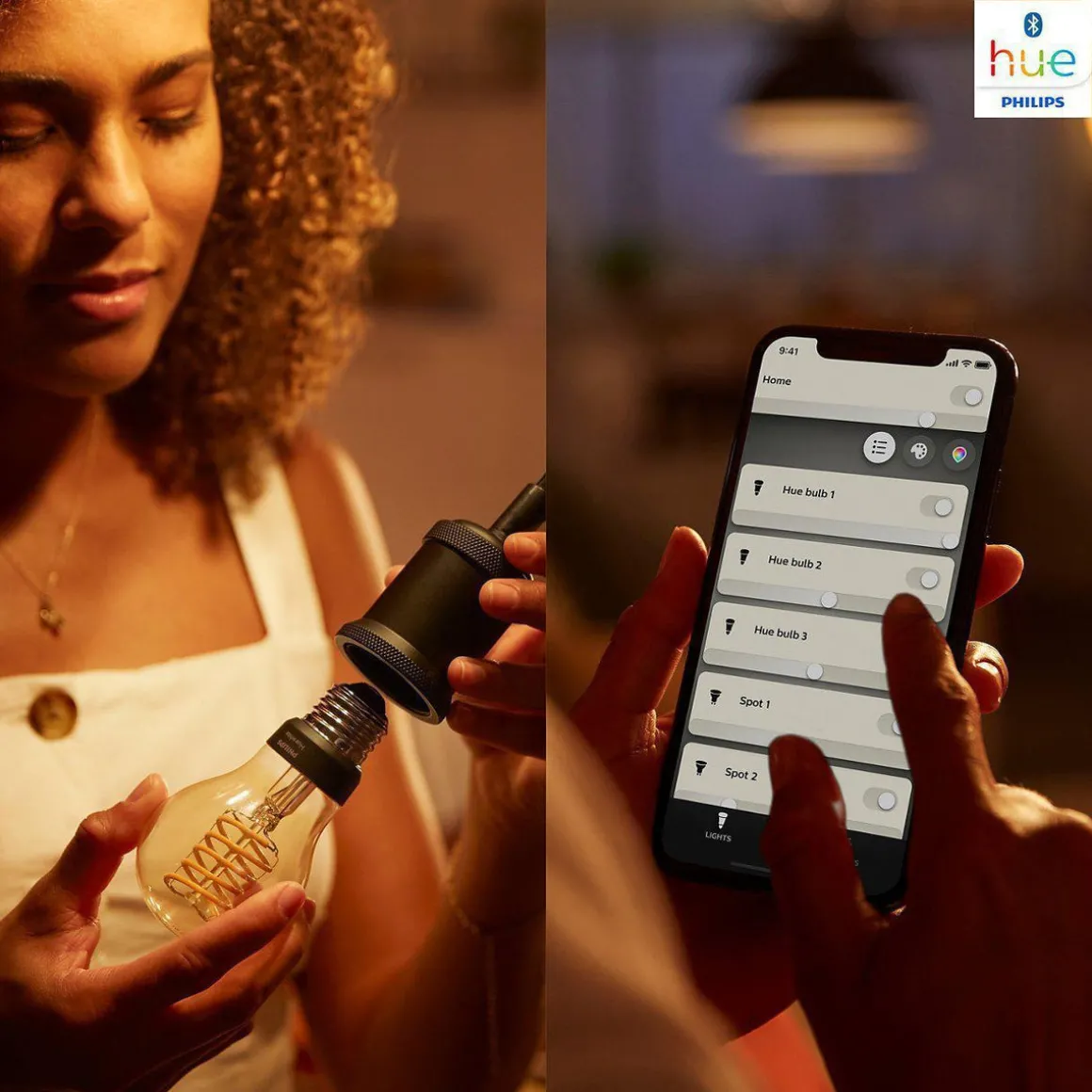 Denne runde LED-lyspæren med spiralformet glødetråd gir et unikt stilinntrykk. Den klassiske designen kombineres med en moderne Hue Bridge- og Bluetooth-funksjonalitet som betyr at den kan dimmes, forsterkes og gjøre alt det som andre smartpærer kan.