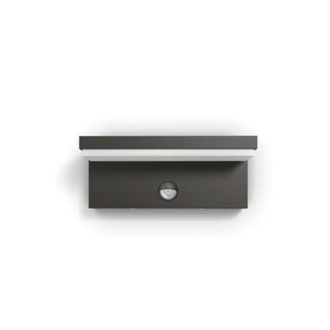 Denne vakre L-formede Philips Bustan-vegglampen i antrasittgrå aluminium av høy kvalitet kaster fra seg et diffust varmhvitt LED-lys på veggen. En bevegelsessensor følger med, slik at den slår seg automatisk på når noen kommer i nærheten.