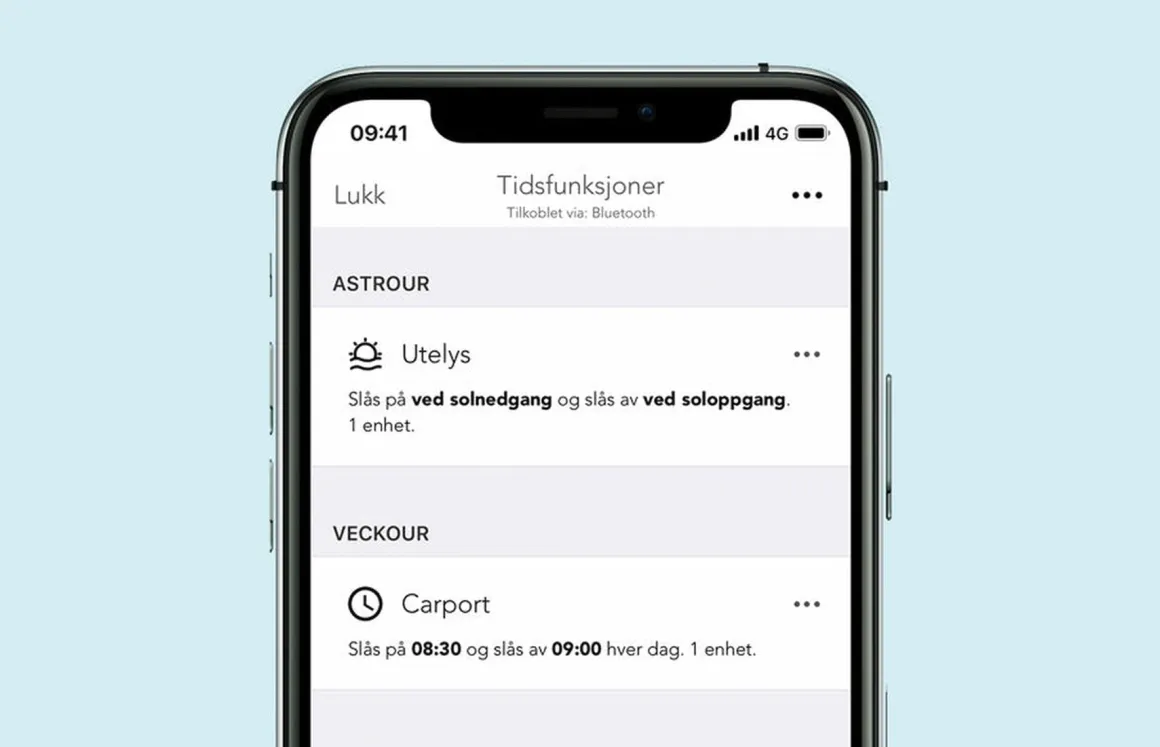 La fasadebelysningen følge soloppgang og solnedgang, eller tenn og slukk lamper på et bestemt tidspunkt. Alle produktene våre har innebygd astro- og ukesur, noe som gjør enkel planlegging mulig.