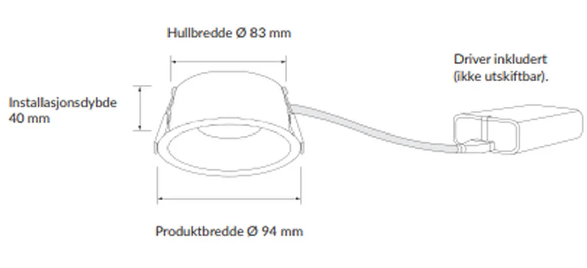*Bruk beskyttelsesboks for å øke IP-graden ved montering i undertak. OBS! Koble ikke til dimmer.