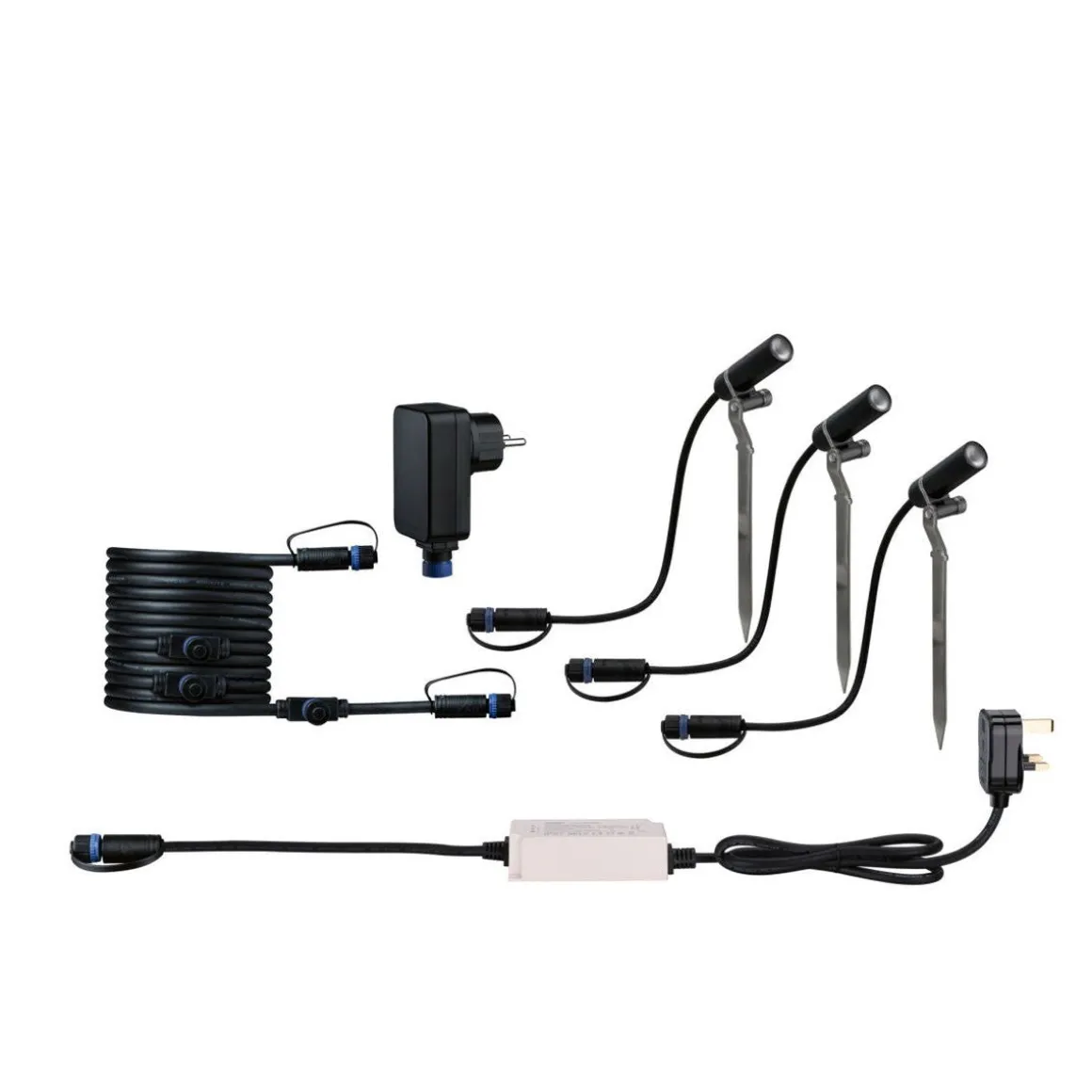 - Plug & Shine grunnsett bestående av tre armaturer, fem meter tilkoblingskabel og transformator