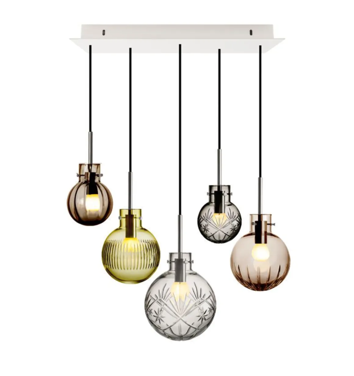 I denne kombinasjonen medfølger følgende krystallkuler: Krystallkulene Finn Klar 200 mm, Finn Røkgrå 120mm, Optikk Kakao 120 mm, Skjær Oliven 160 mm og Stor Stjerne Kakao 160mm. Ståloppheng til 5 Krystallkuler med sort tekstiltrukket kabel på 3 meter. Sort rektangulær takbaldakin 50cm
