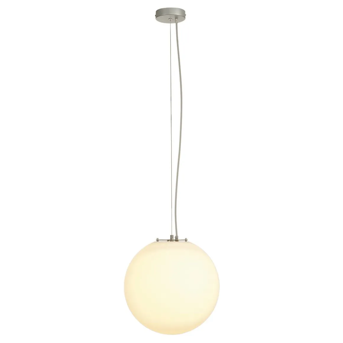ROTOBALL 40 er en kuleformet 230V pendelarmatur og består av en armaturskjerm i temperaturbestandig plast som er rammet inn av en holder i sølvgrått stål. Den store armaturskjermen sørger for en jevn belysning fra sparelyskilden med vanlig E27-sokkel. En passende takrosett er inkludert i leveransen. Dermed er ROTOBALL 40 pendelarmatur klar for direkte tilkobling til 230 V nettspenning.