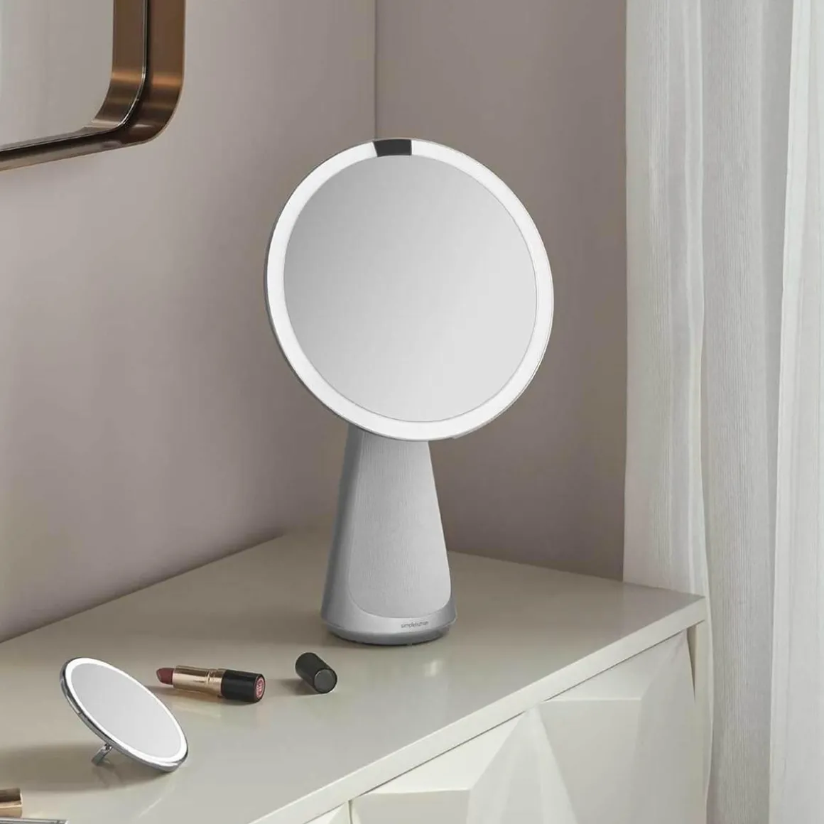 Speilet tru-lux lyssystem, som simulerer naturlig sollys, slik at du alltid vil vite når sminken din er fargekorrekt og feilfri. Bruk lysstyringslinjen til å endre lysstyrkenivået eller speile deg i et mykere lys. Last ned appen Simplehuman Mirror for å justere lydtoner, få tilgang til forhåndsinnstillinger for lys, eller slå på smarte funksjoner som nattlysmodus.