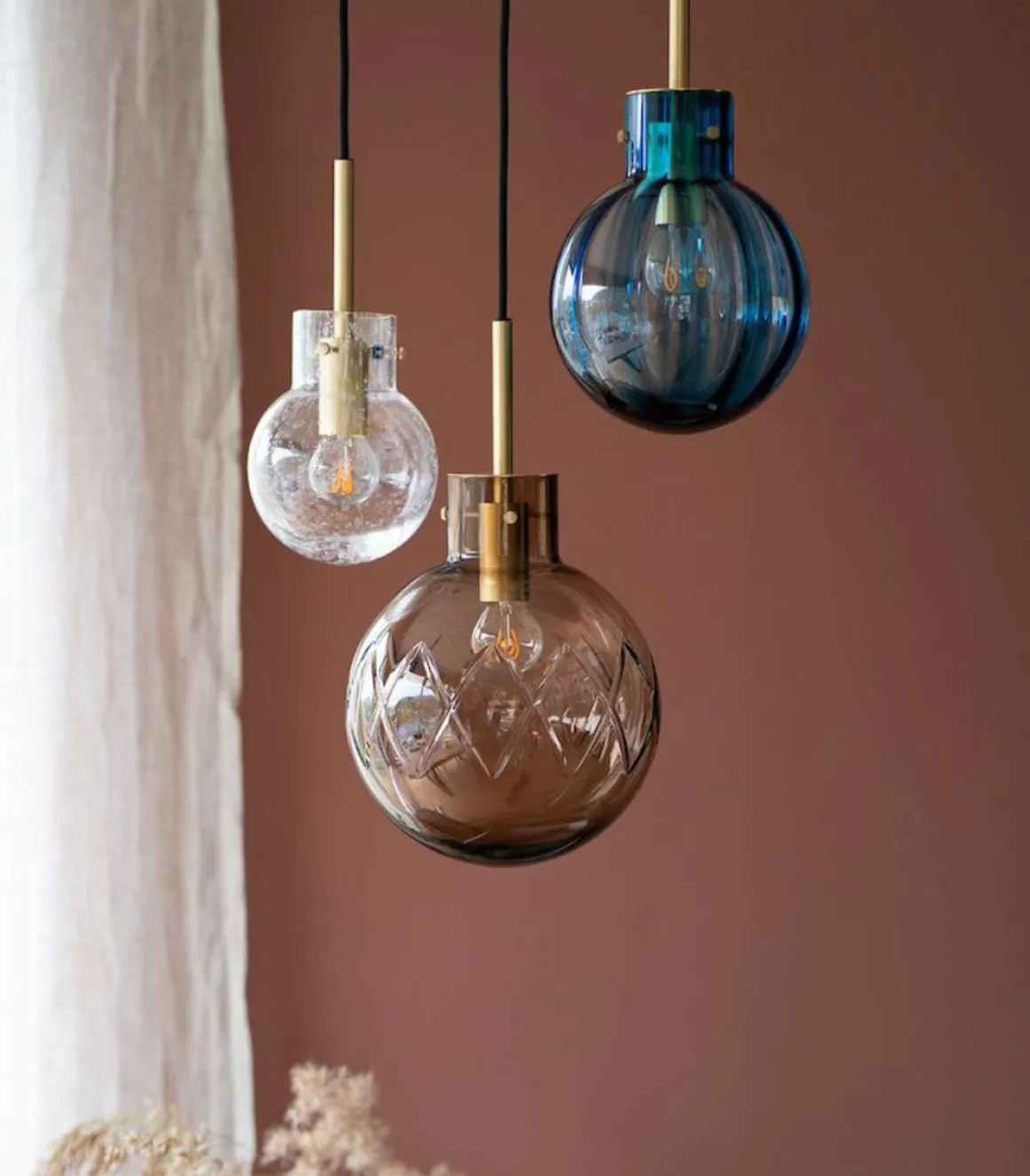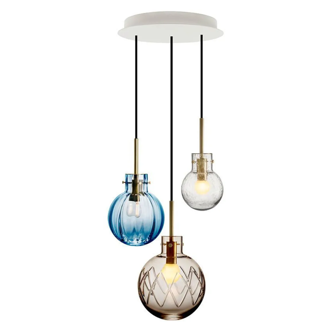 I denne kombinasjonen er det brukt følgende krystallkuler: Kryss morgenrød 200 mm, optikk klar 160 mm og soda varmgul 120 mm. Messingoppheng til 3 krystallkuler med sort tekstiltrukket kabel på 3 meter. Sort rund takbaldakin 34cm.