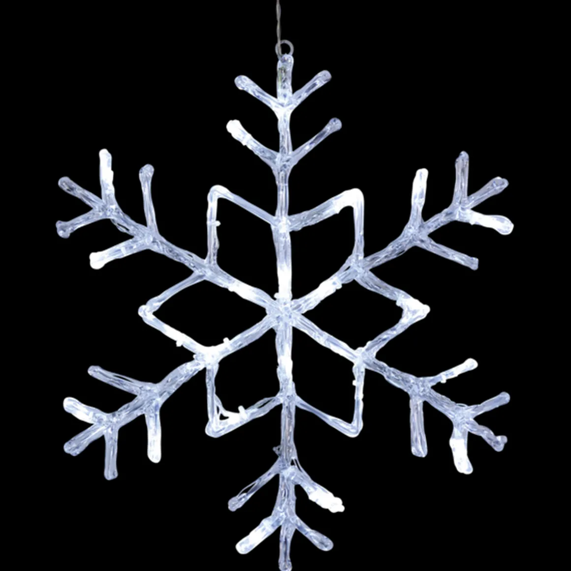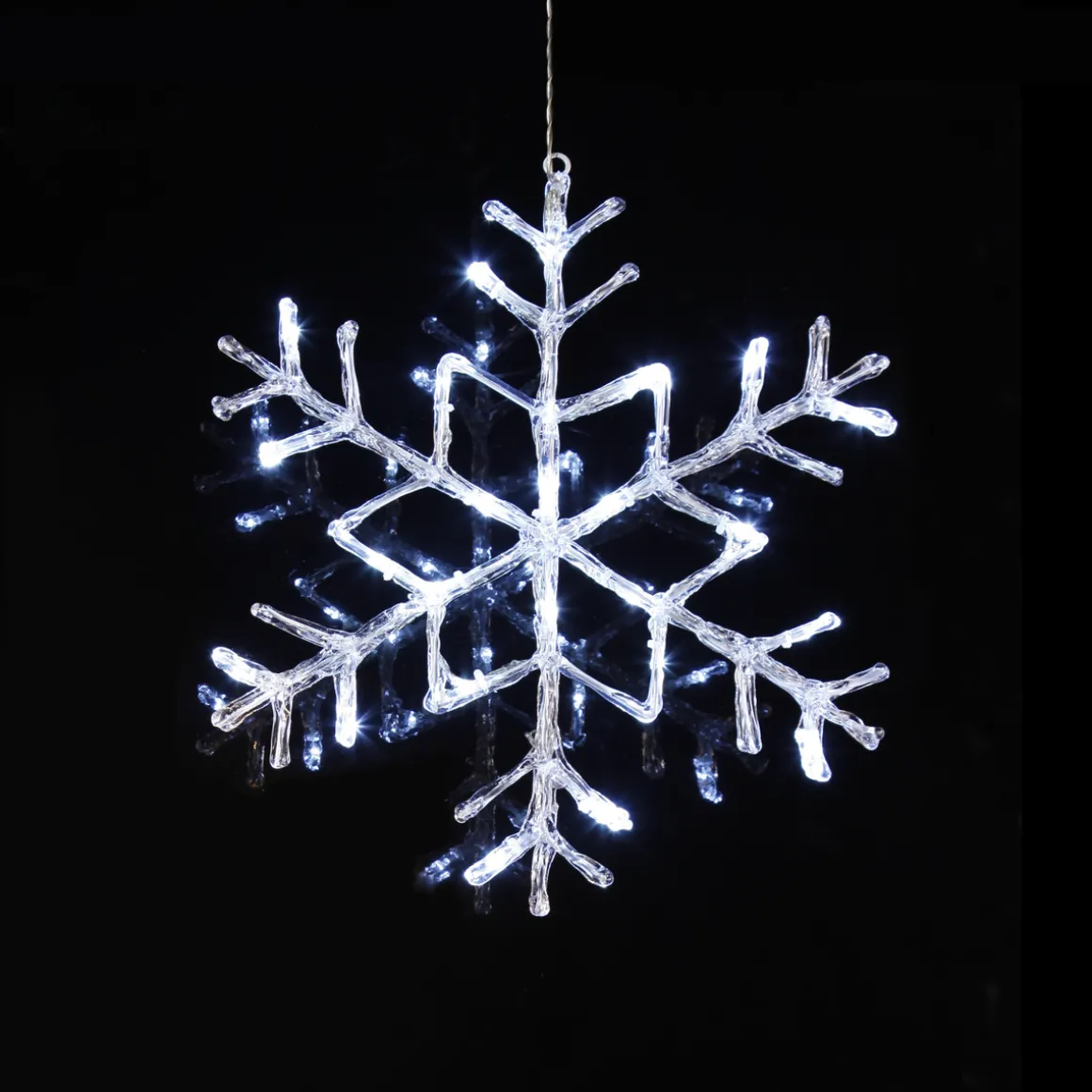 Hengende snøfnugg for utendørs bruk. Vakker dekor til å henge i hagen. Snøfnugget gir en fin glød og skaper en fantastisk atmosfære i mørket.