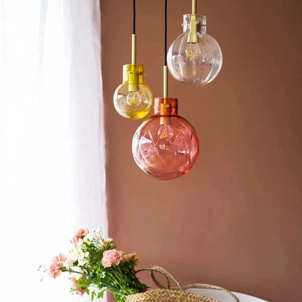 I denne kombinasjonen er det brukt følgende krystallkuler: Kryss morgenrød 200 mm, optikk klar 160 mm og soda varmgul 120 mm. Messingoppheng til 3 krystallkuler med sort tekstiltrukket kabel på 3 meter. Hvit rund takbaldakin 34cm.