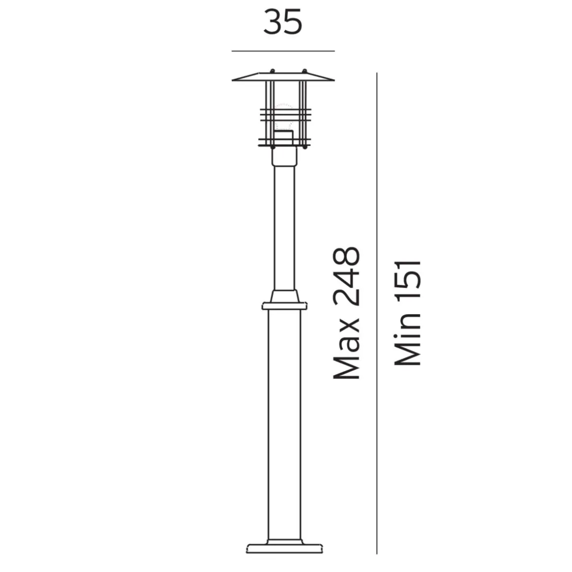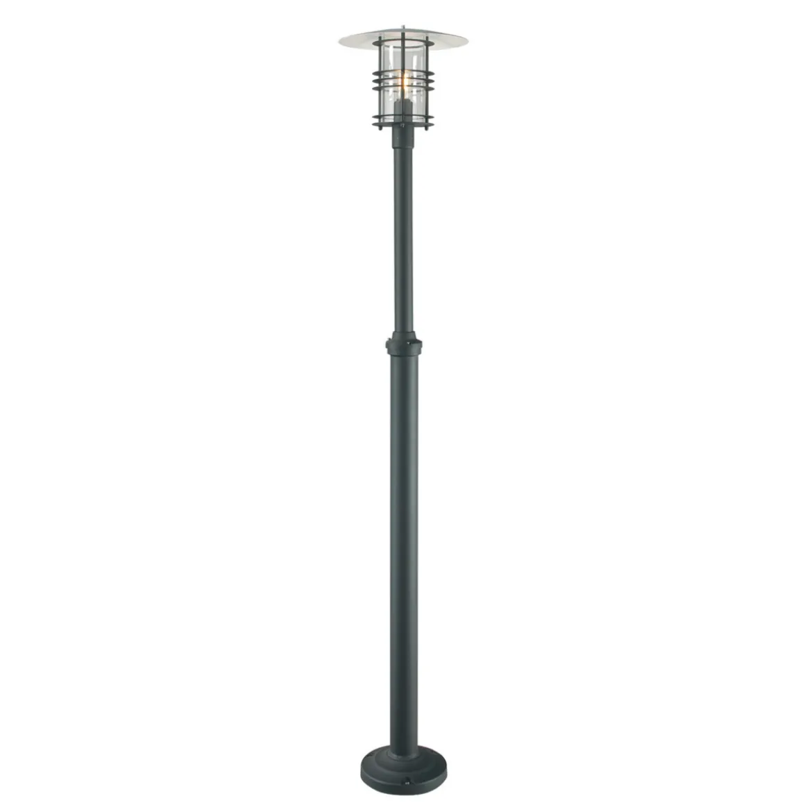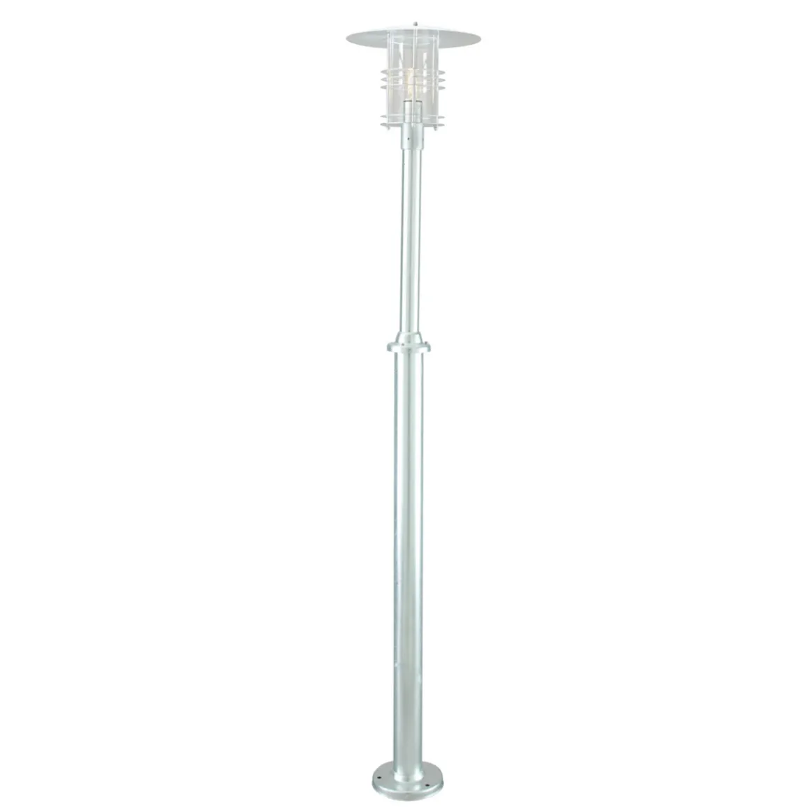 Stolpelampen leveres i fargene galvanisert stål og sort.