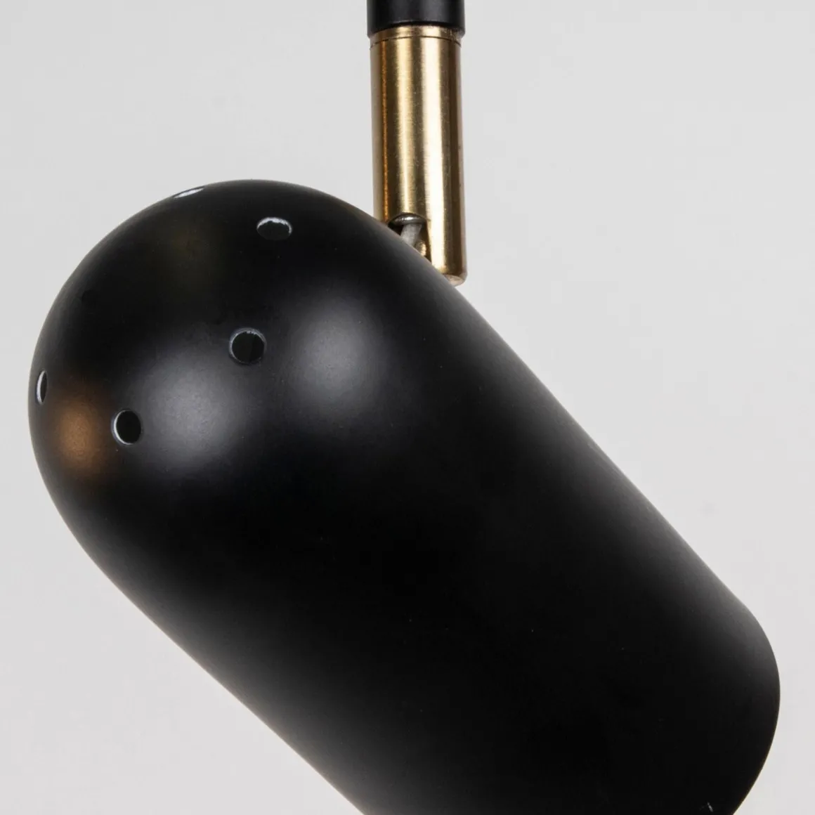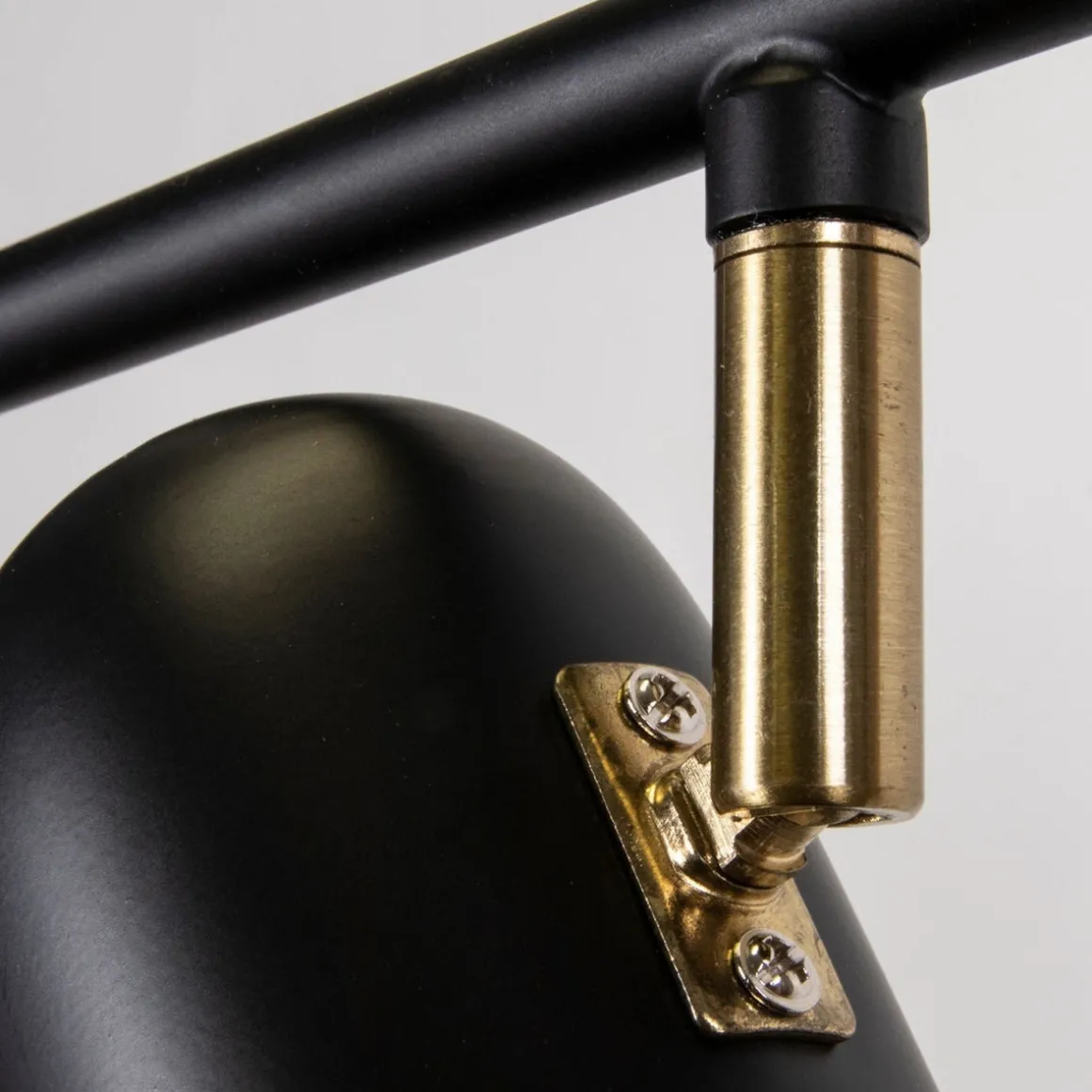 Lampen er laget av hvit lakkert metall med detaljer i børstet messing. Lampen har en 200 cm lang hvit tekstil ledning med koblingsboks.