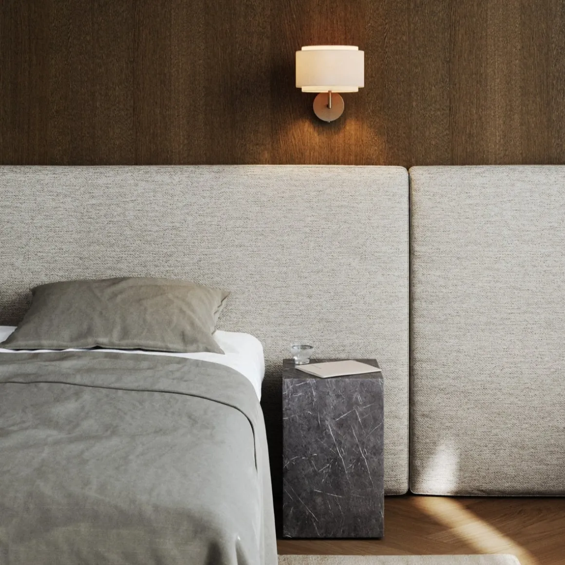 Takai vegglampe fra Studio Mavro//Lefèvre av Sofie Lefèvre har en stoffskjerm med en vakker form som inviterer deg til å betrakte den fra mange ulike vinkler. Kombinasjonen av linskjermen og den polerte messingbasen skaper et veldig mykt og varmt designspråk.