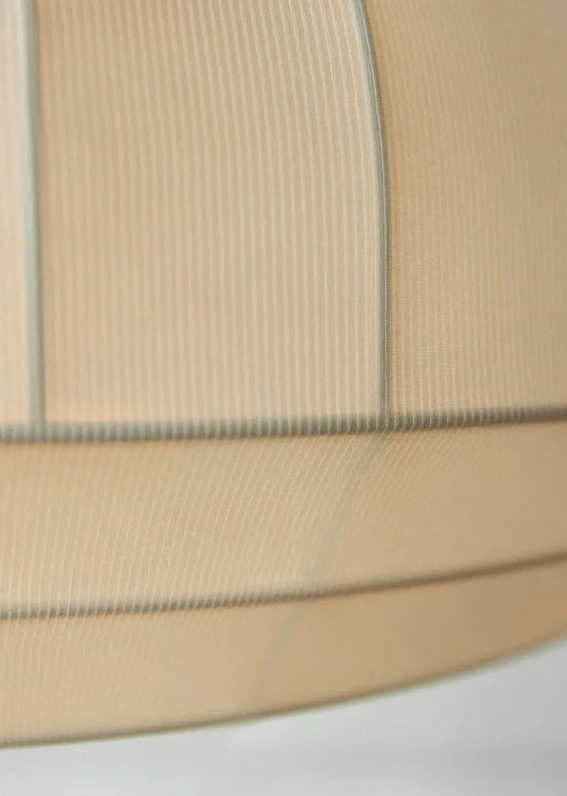 Denne distinkte og dekorative designen med sin finstrikkede nyanse vil skape en vakker atmosfære, komplementere innredningen din og forbedre opplevelsen av hjemmet. Skjermen er laget av off-white polyesterrør og strekkes forsiktig over den hvite metallrammen før den festes øverst og nederst. Tilgjengelig i tre former, «Small», «Tall» og «Large Oval», er strømkabelen også skjult i en ren silkeledning.