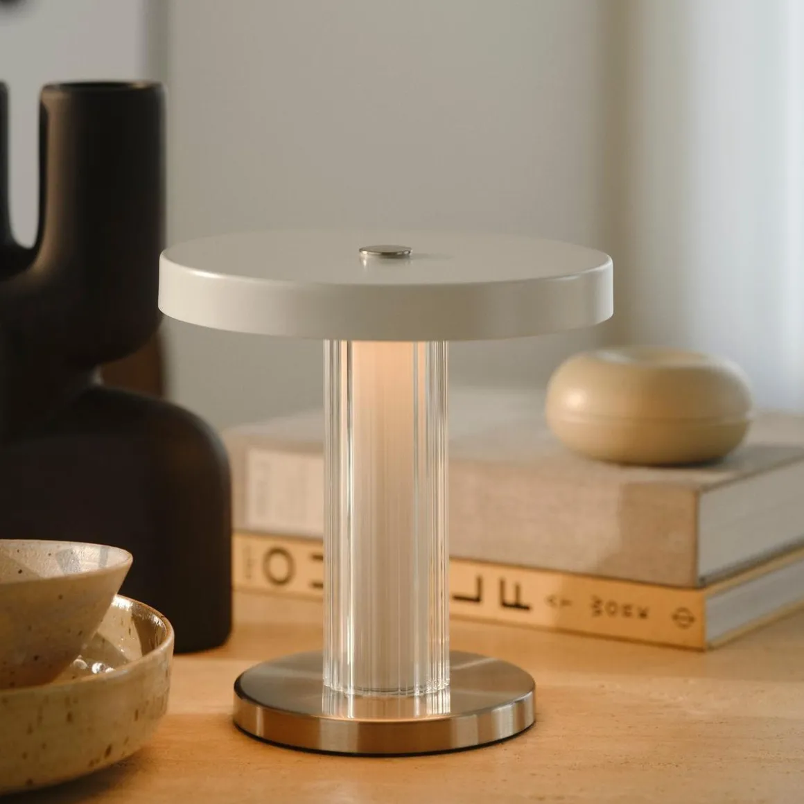 Denne elegante, transportable lampen, Trezzi, er designet av den danske designduoen Anker Studio. Trezzi er utført i et moderne og elegant design som med sitt riflede glass henter inspirasjon fra vintage Art Deco-stil. Demp lyset i tre trinn på bryteren for å skape den perfekte stemningen. Lampen lades enkelt med den medfølgende USB-kabelen.