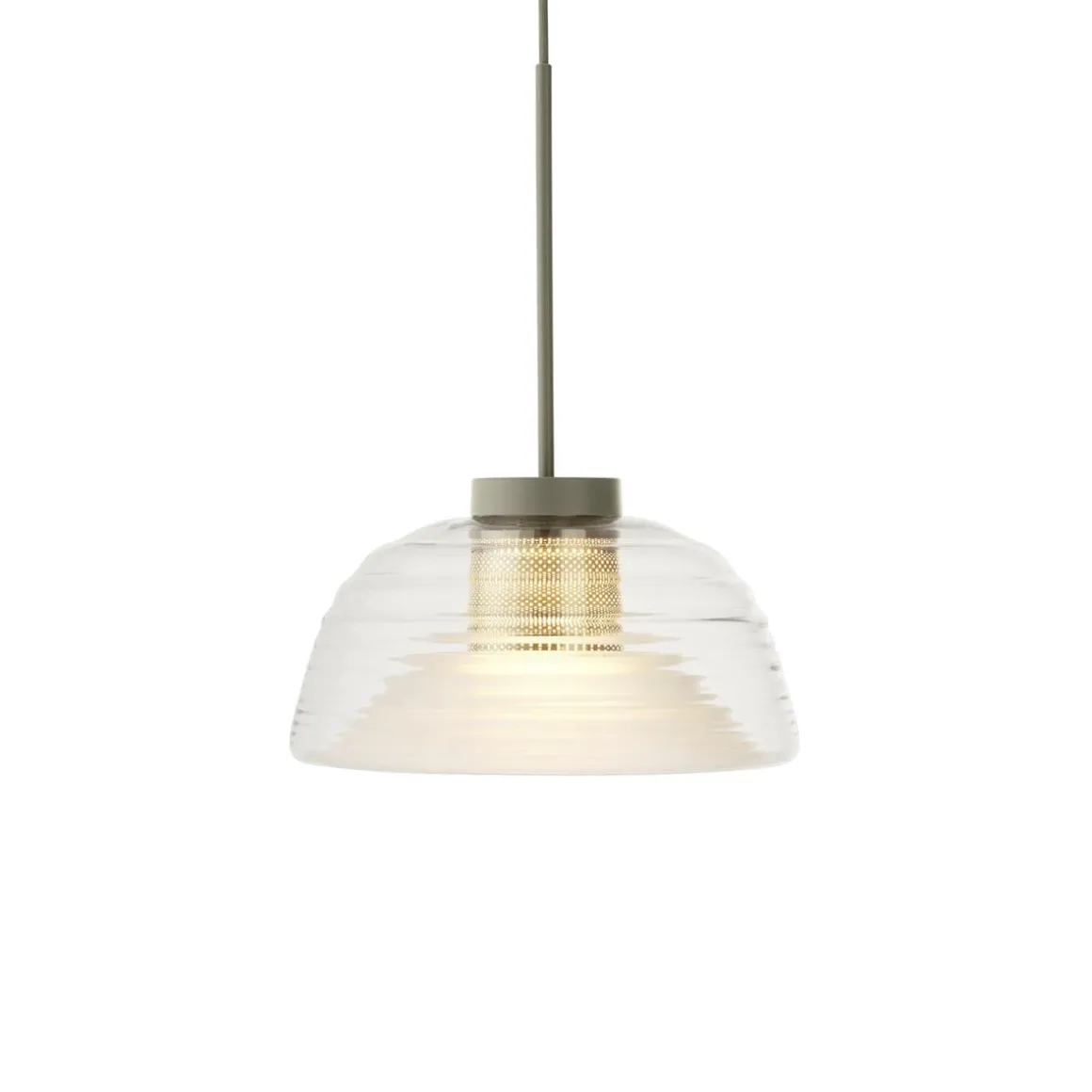 - Materiale: Munnblåst glasskjerm, dyptrukket og perforert metallnett, spunnet opphengskappe, stålpendelrør.
