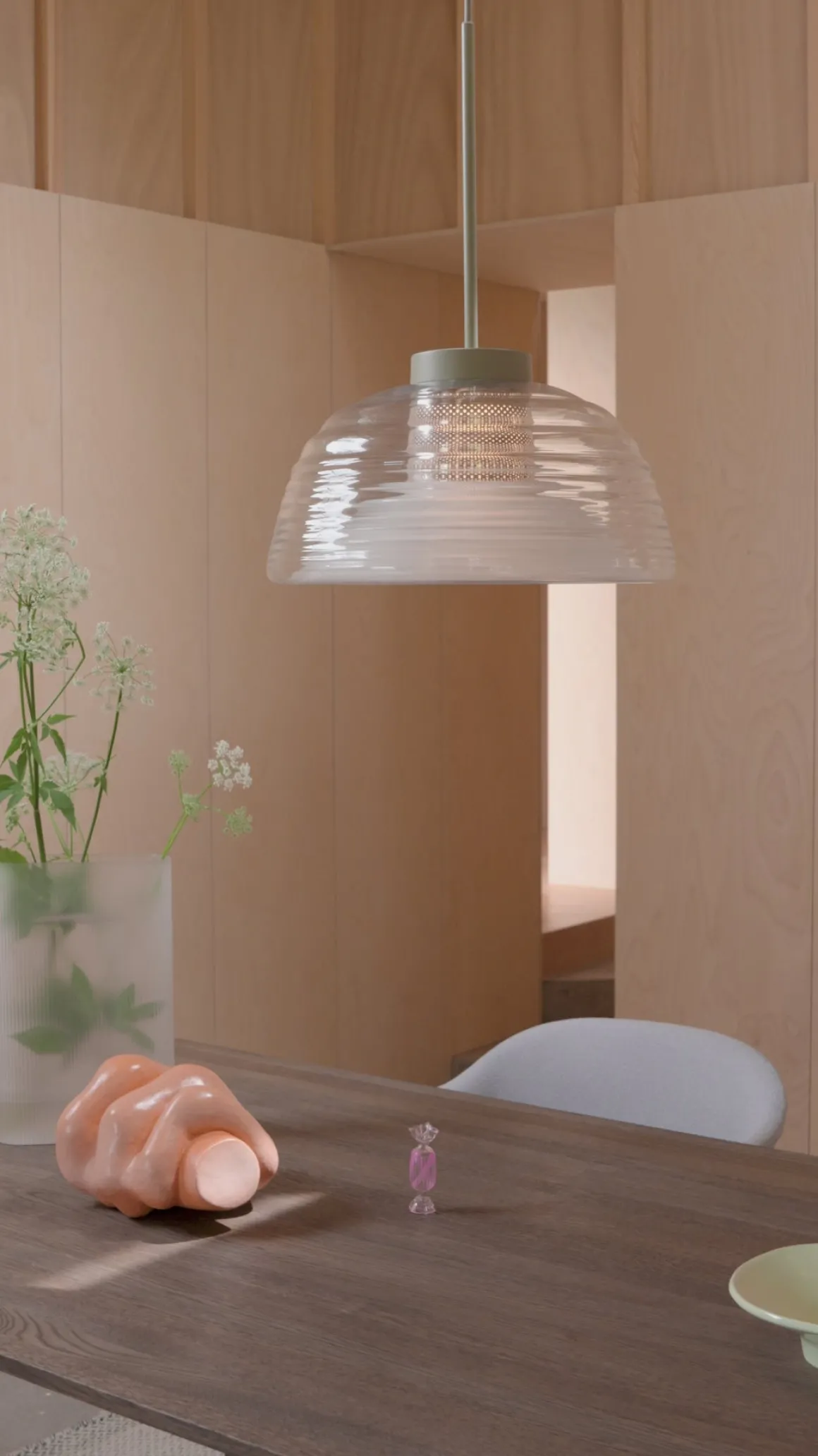 Den to-lags pendellampen gir nye perspektiver til den klassiske glasspendelen med sitt riflede, munnblåste glass, som skaper unike optiske effekter fra forskjellige vinkler. Dette raffinerte designet kombinerer klart og frostet glass med et perforert stålnett, som gir rikelig med blendingsfritt lys.