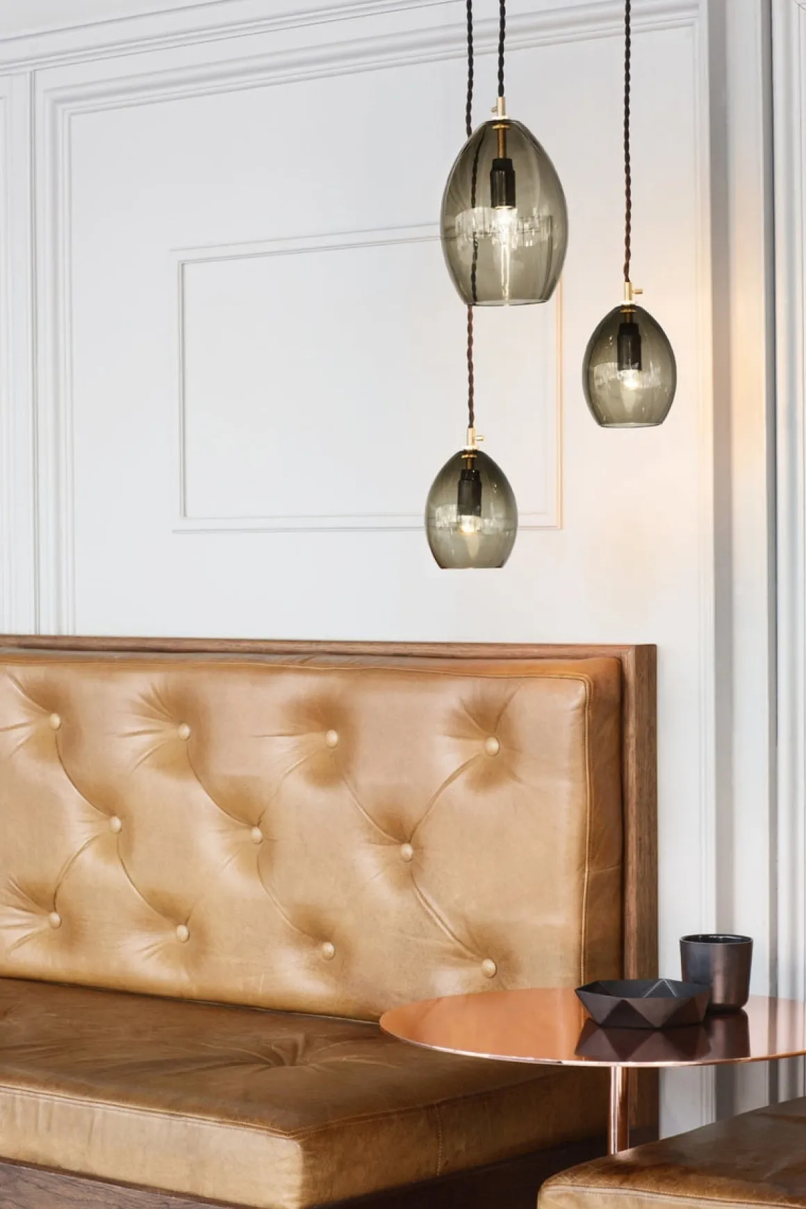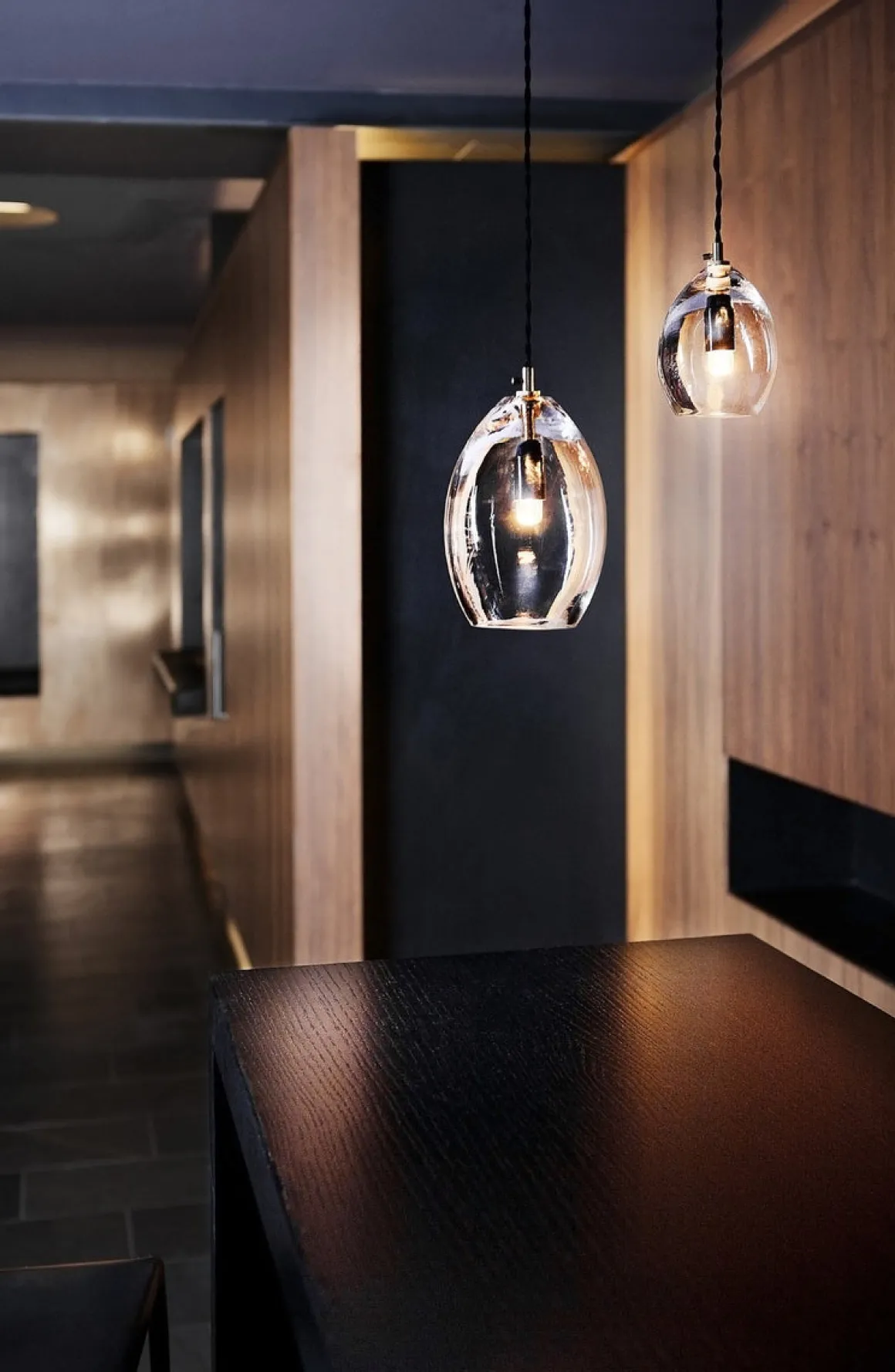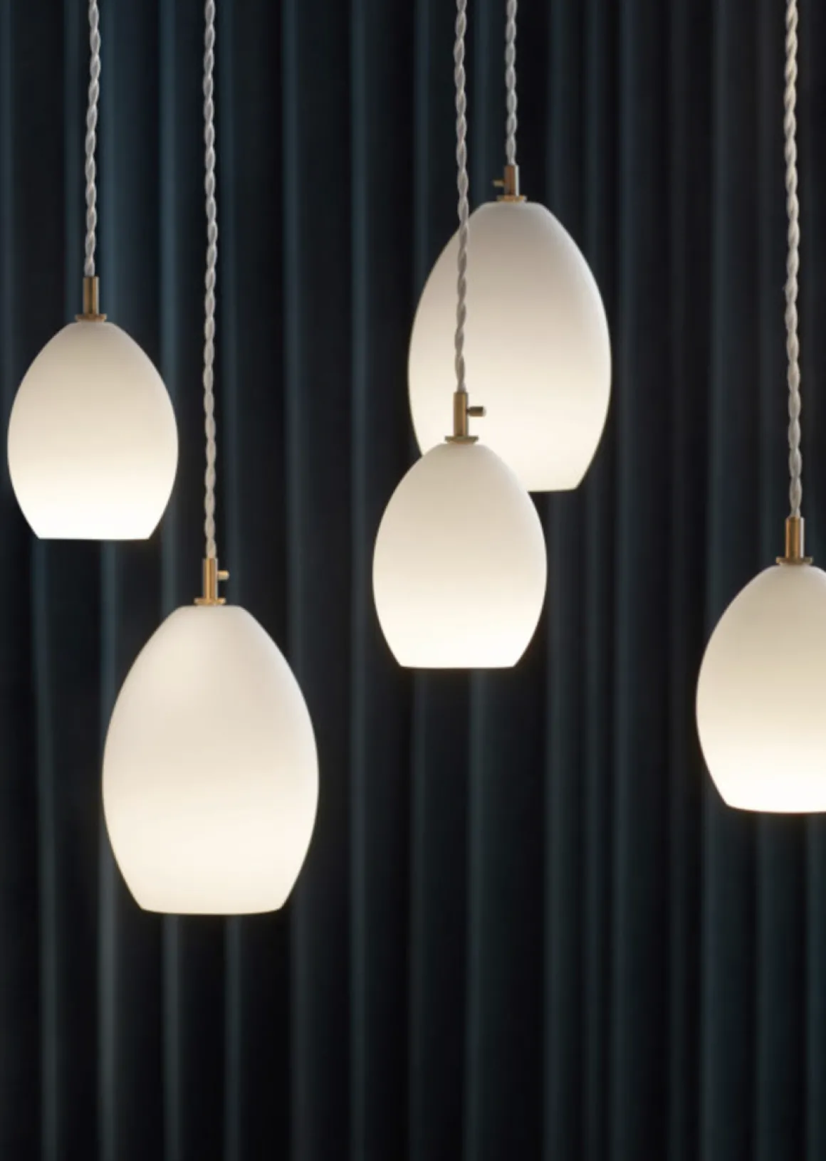 Unika pendlene ble designet i 2012 av designduoen Anne Louise Due de Fønss & Anders Lundqvist. Nydelig munnblåst glass, messingdetaljer og sort tekstilledning. Fin å bruke alene eller sammen med flere. Gir generell belysning.