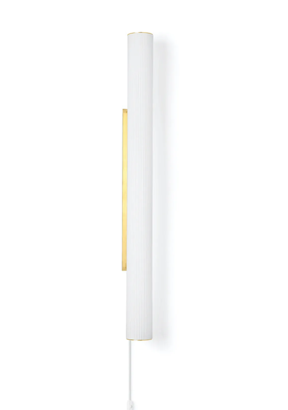 Vuelta vegglampe fra Ferm Living smelter sammen kompleksitet med moderne enkelhet og har sylindrisk opalt glass med en tydelig rillet overflate og detaljer i messing. Lampen har en LED-lyskilde som avgir et mykt, diffust lys. Det medfølger en fjernkontroll som dimmer lyset for optimal atmosfære i rommet.