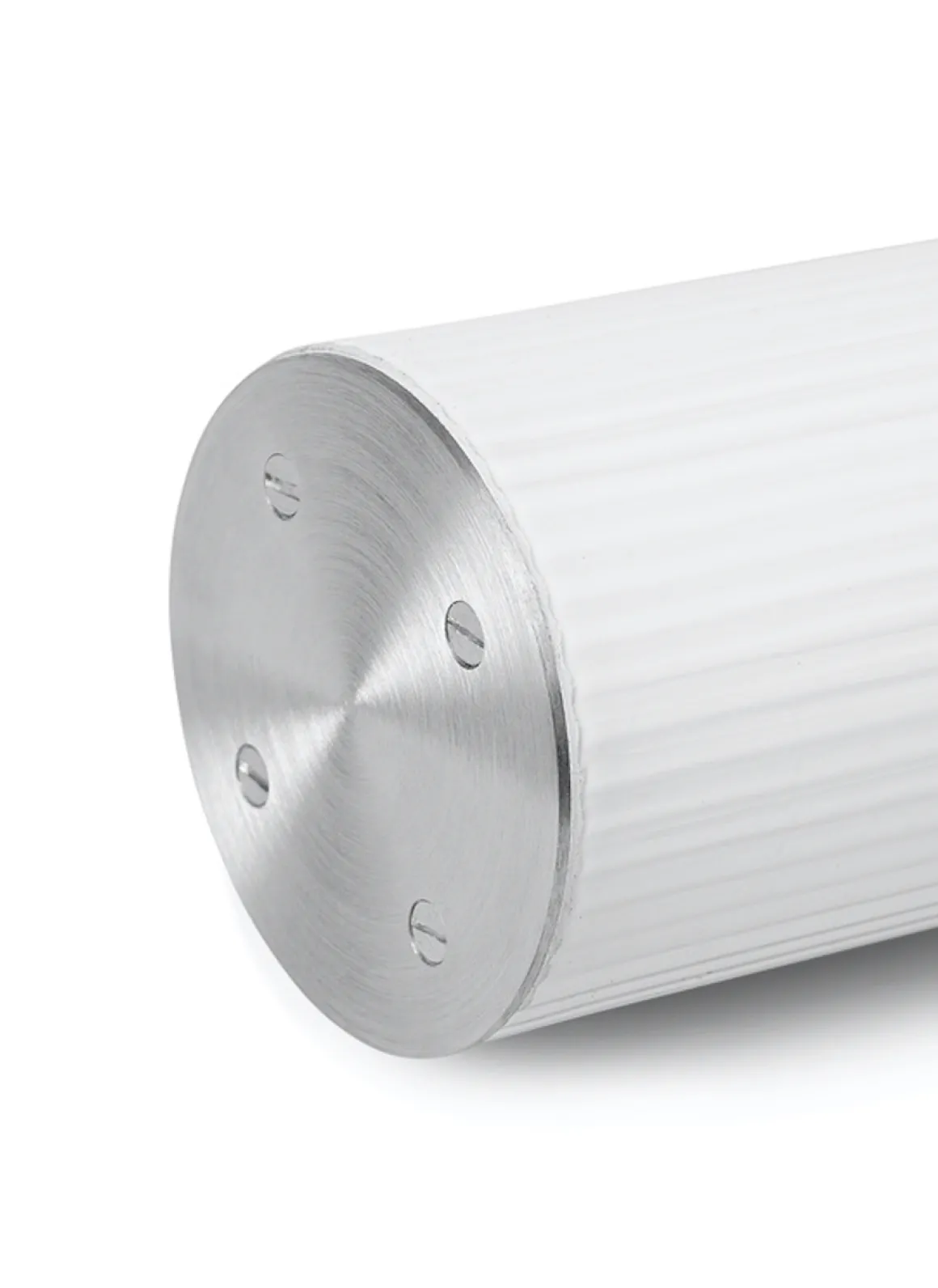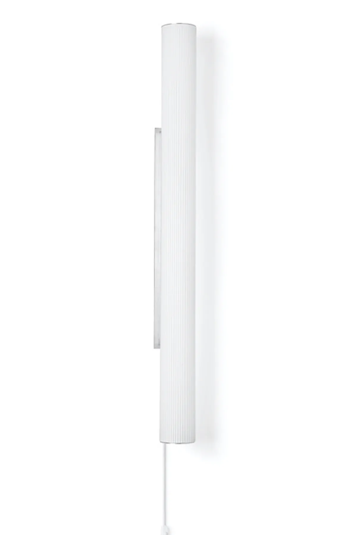 Vuelta vegglampe fra Ferm Living smelter sammen kompleksitet med moderne enkelhet og har sylindrisk opalt glass med en tydelig rillet overflate og detaljer i messing. Lampen har en LED-lyskilde som avgir et mykt, diffust lys. Det medfølger en fjernkontroll som dimmer lyset for optimal atmosfære i rommet.