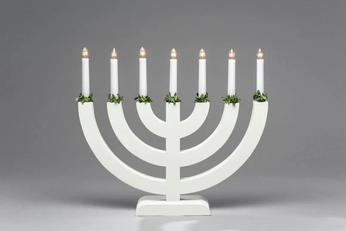 Hvit adventsstake med 5 armer og grønne mansjetter.