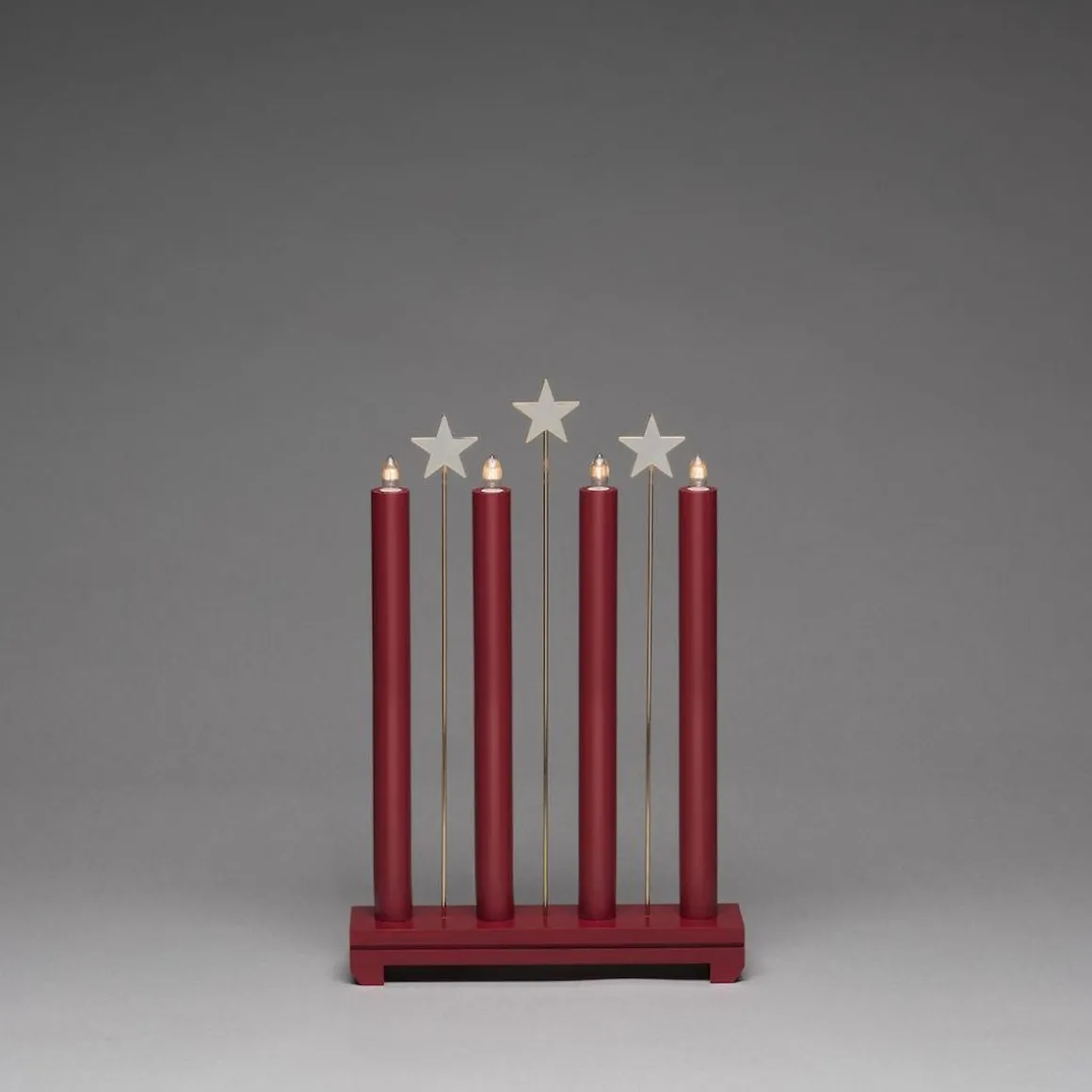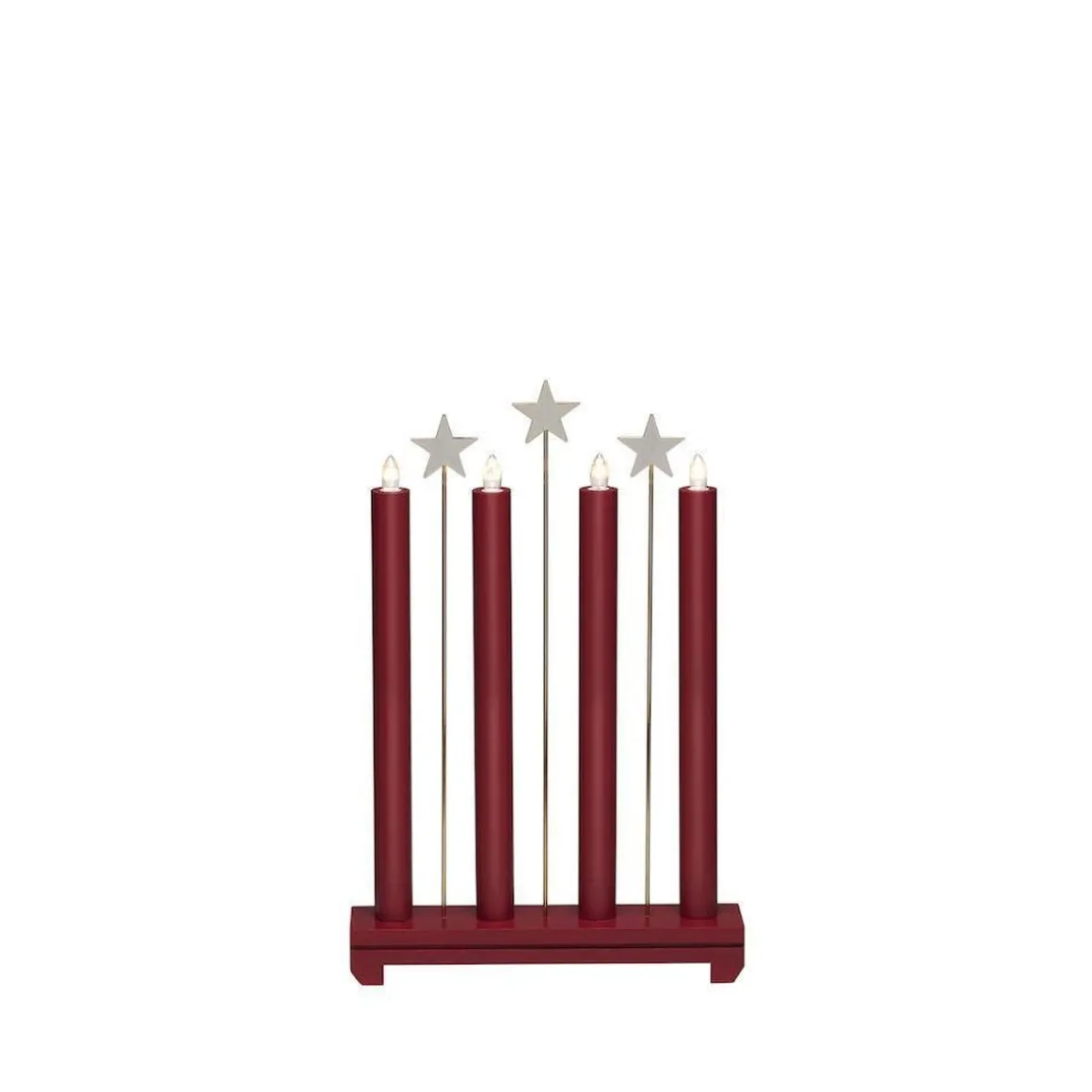 Kom i julestemning med den flotte adventsstaken i rød med 4 lys og 3 dekorstjerner.