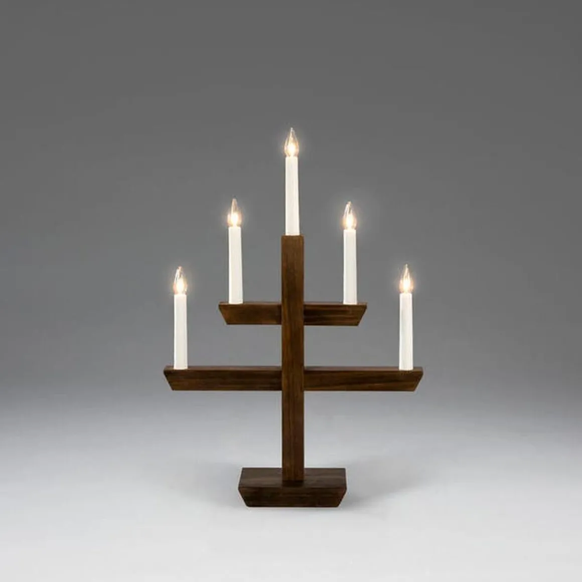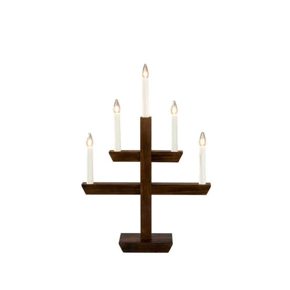 Stilig adventslysestake i beiset treverk som skaper en varm og innbydende følelse i vintermørket. Med fem lys og et klassisk design er den like vakker i vinduet som på bordet – en tidløs julefavoritt som sprer lys og hygge år etter år.