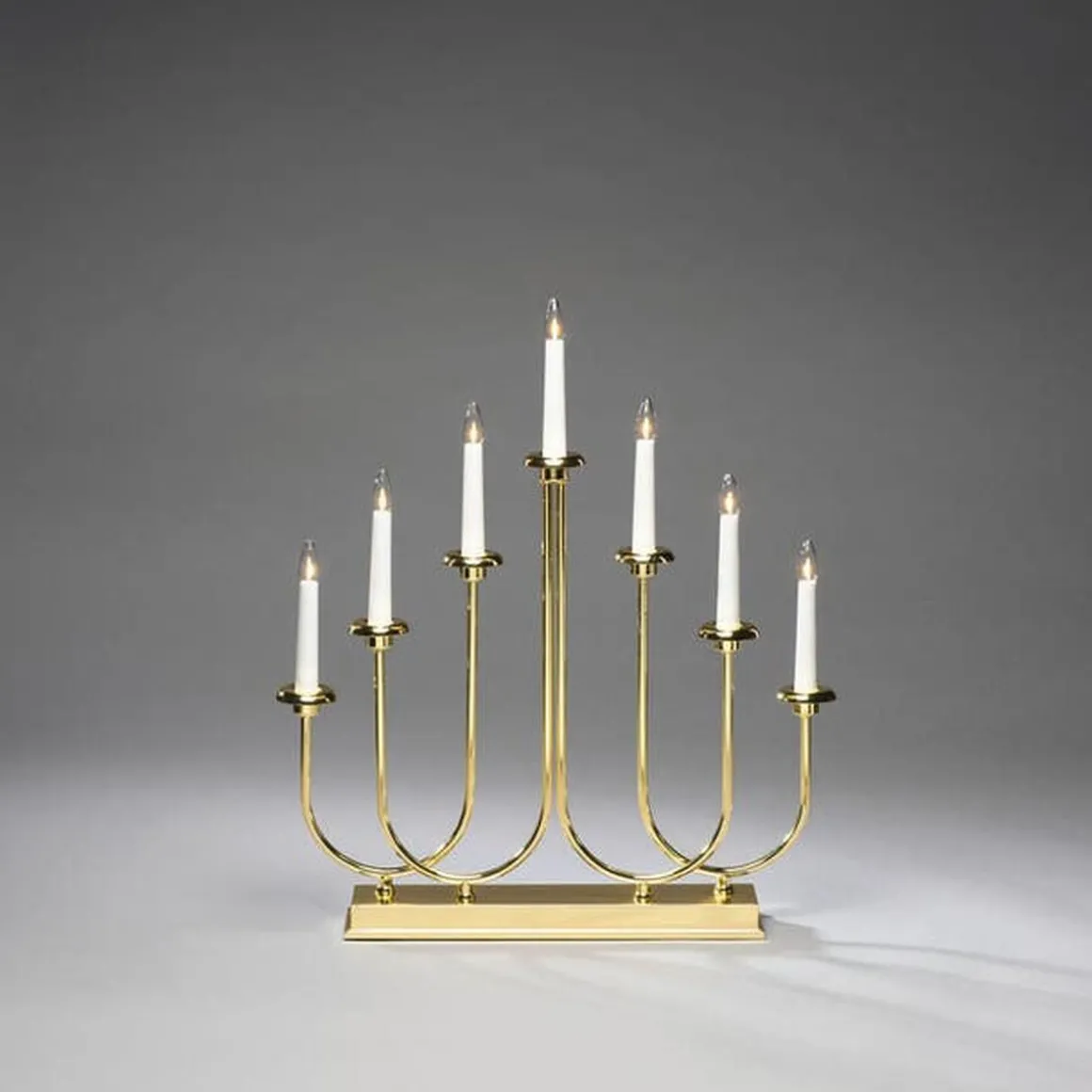 Adventstake 7 armet i messingbelagt metall. Adventstaken har klare pærer og den er utstyrt med inebygget dimmer slik at du selv kan bestemme ønsket lysstyrke.