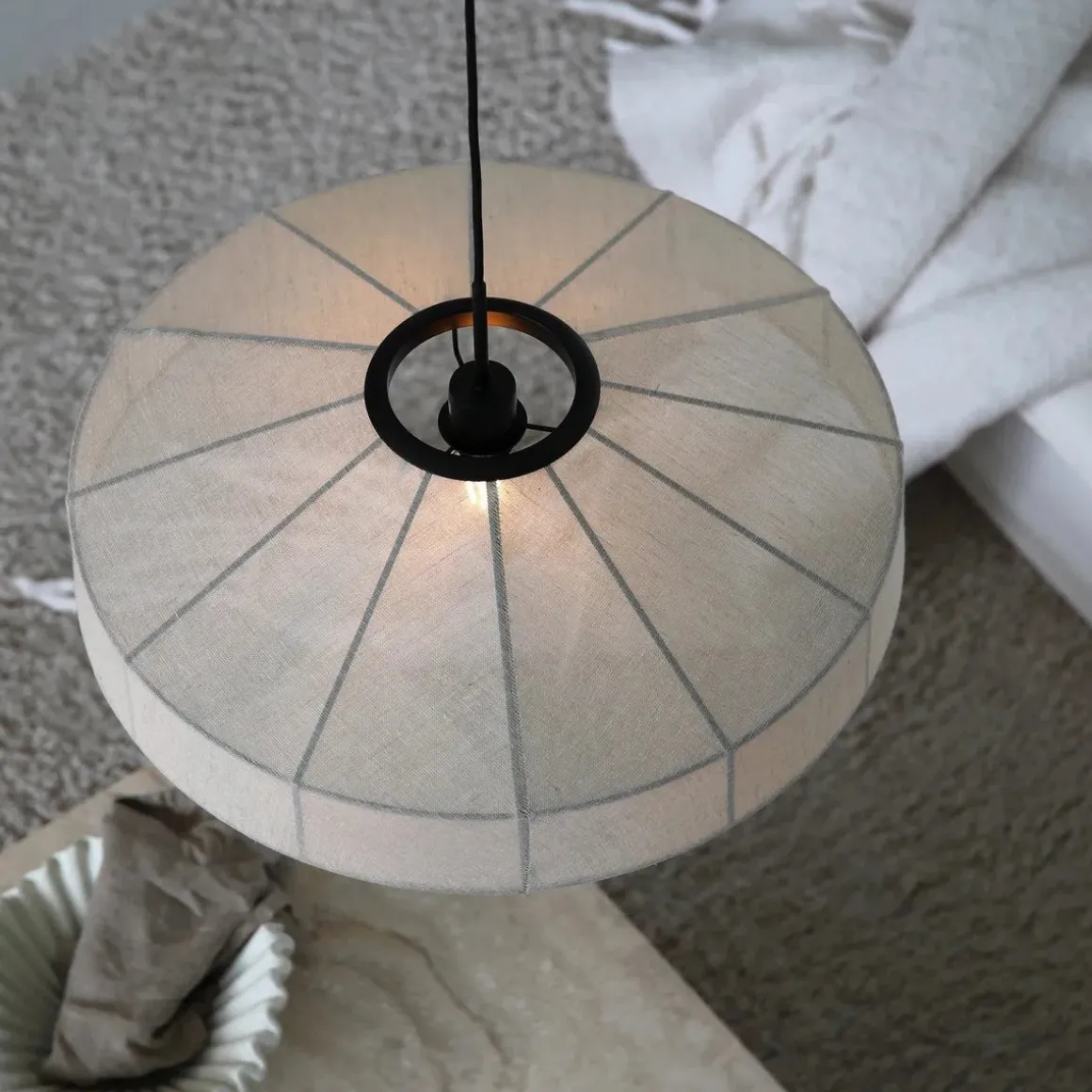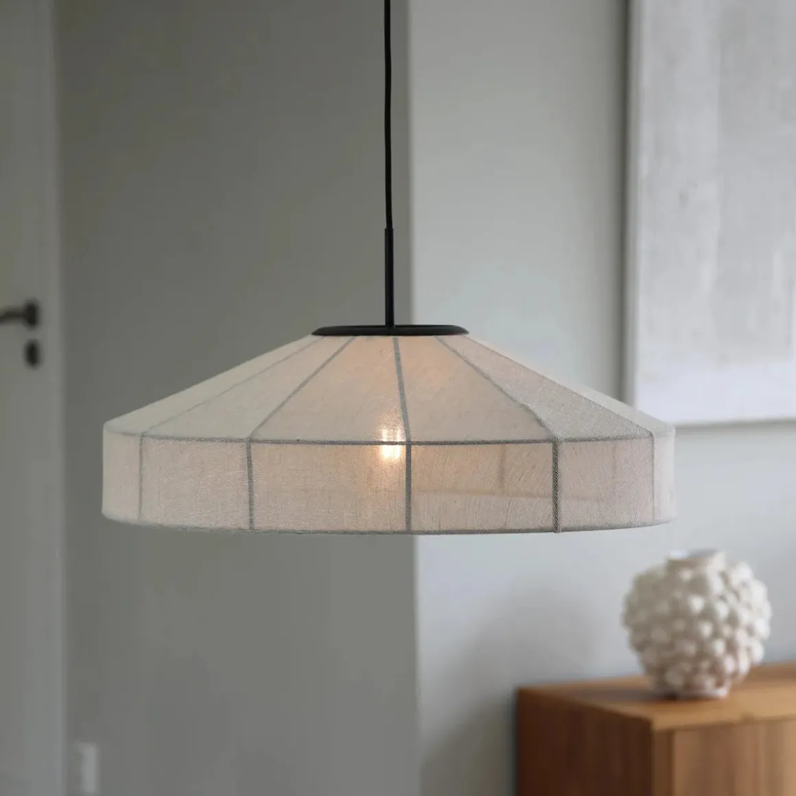 Alia viser hvordan tekstil og metall kan kombineres i en balansert form. Den beige linskjermen er omgitt av en svart ramme som gir en tydelig kontrast. Alia passer godt over spisebordet