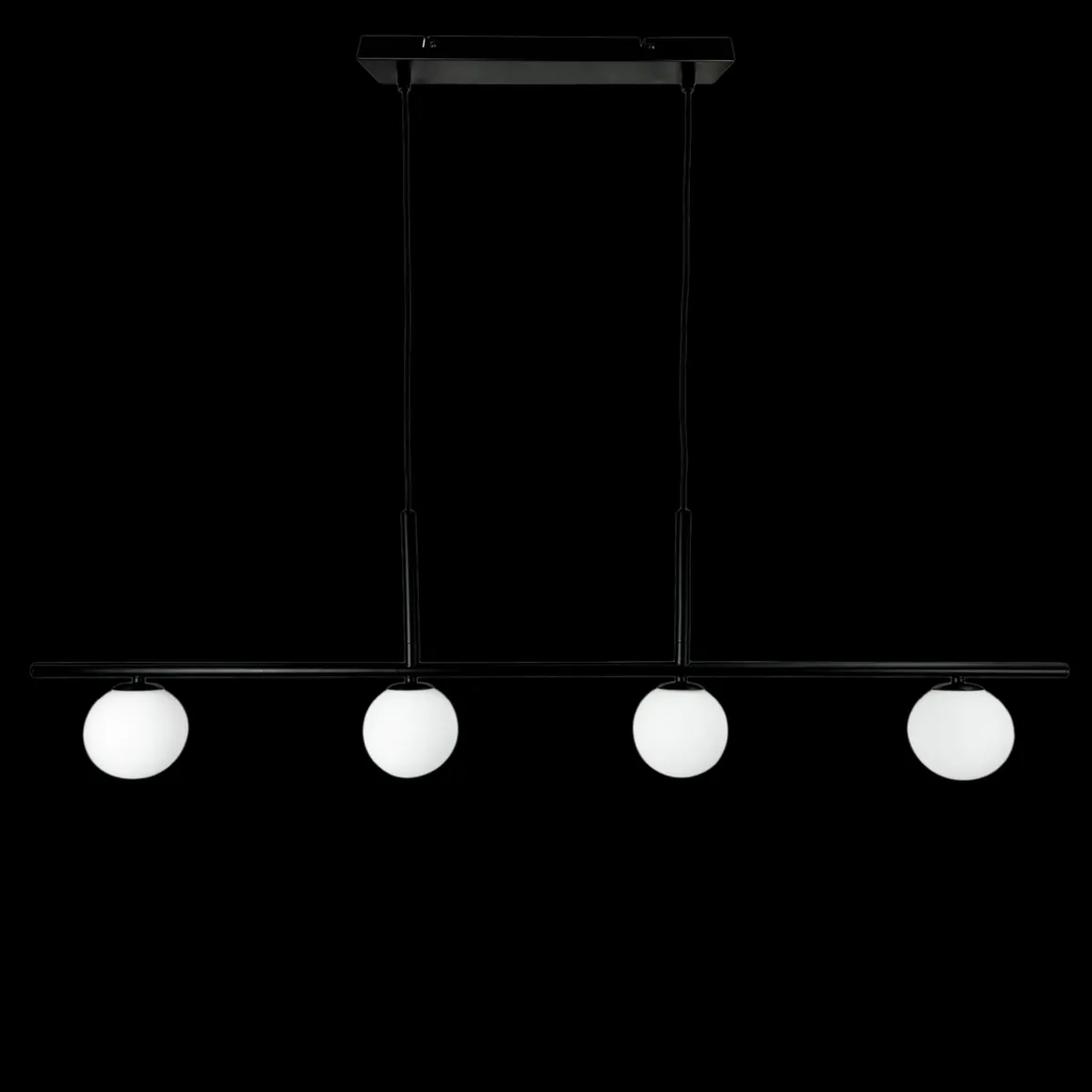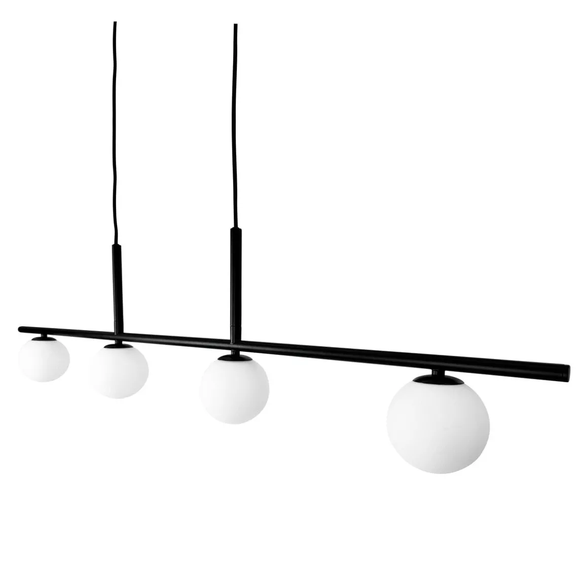 ALICE er en pendel som skal henge over og lyse opp det lange spisebordet. På grunn av størrelsen er denne pendellampen også ideell for kjøkkenøya og bordet. Den enkle, men elegante lampen er laget av metall med en matt svart finish og har 4 lyskilder, hver inne i sin egen opalglasskuppel. Metallet sørger for at lampen henger vakkert, og opalglasset gir et diffust, men sterkt lys som beveger seg i alle retninger.