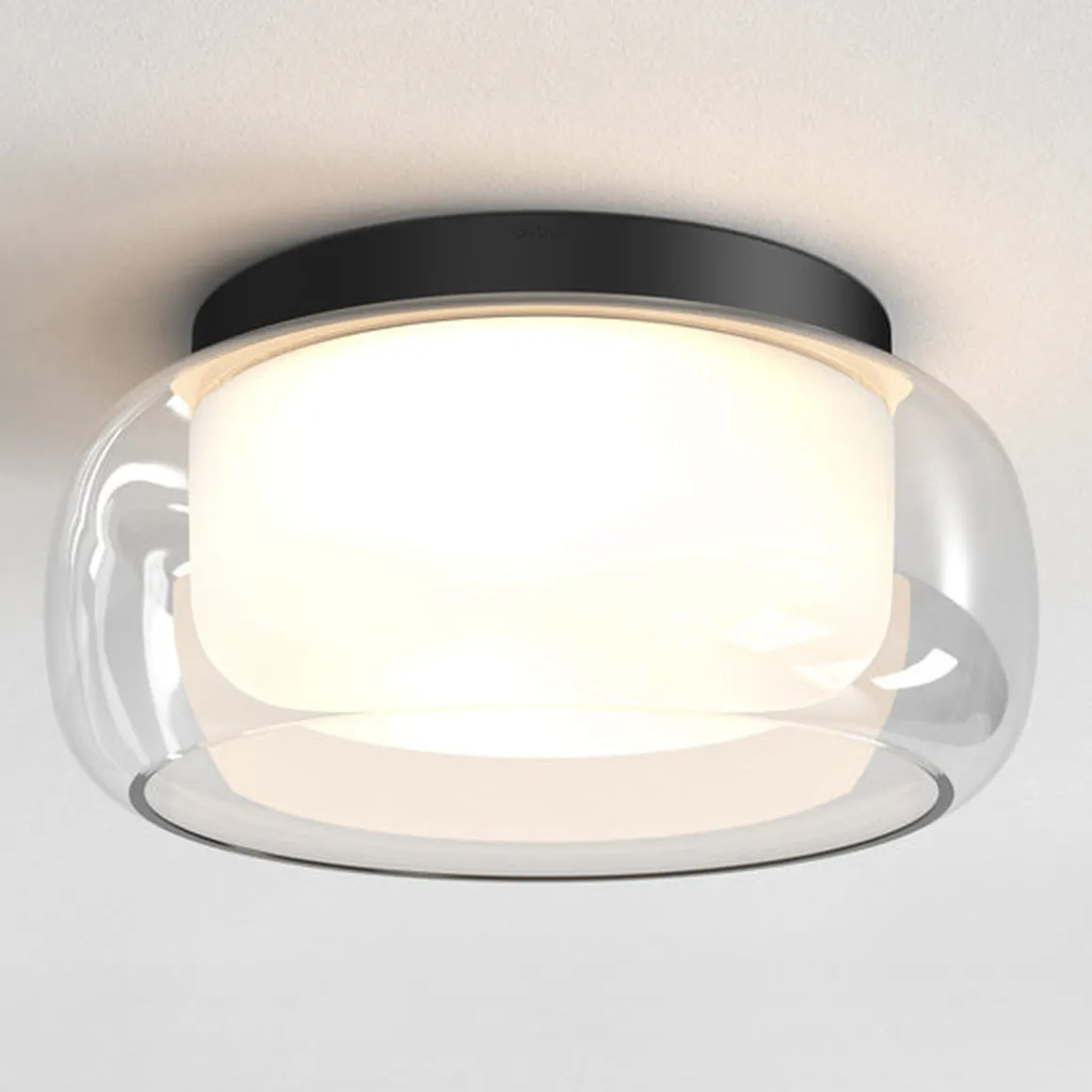 Med sine organiske kurver inspirert av elliptiske former, myker taklampen Aquina et baderomsutseende og gir atmosfærisk arbeidsbelysning når den brukes som hovedlyskilde. Den utskiftbare doble glassskjermen er sikret med design og har ingen synlige fester for en sømløs finish.