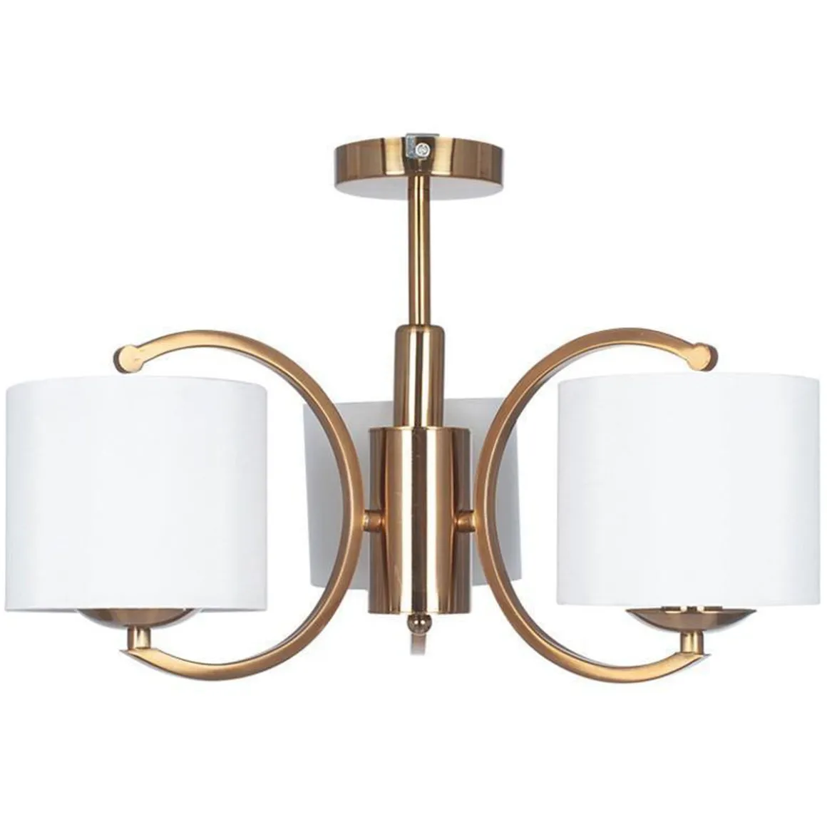 Taklampe med 3 armer i messing. Hver arm er utstyrt med en rund lys skjerm.