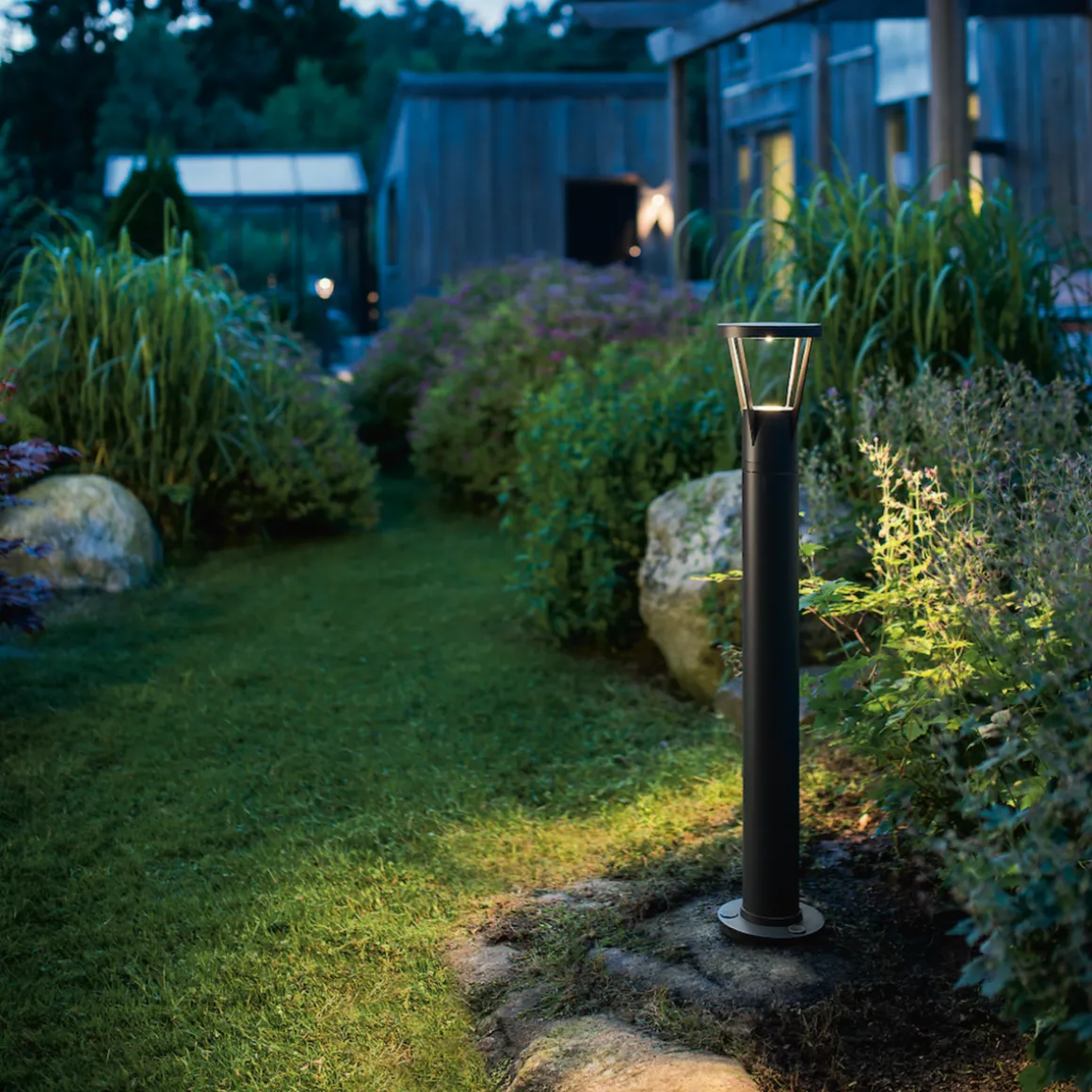 LED-pullert i moderne design til hage og gangveier. Armaturen er utført i trykkstøpt aluminium pulverlakkert i grå eller sort, med avskjerming i herdet glass. Finnes som høy og lav pullert, samt veggarmatur. Montert med utskiftbar GU10 LED som gir et mykt lys. Dimbar med faseavsnittdimmer. Vi anbefaler LEDDim 400 og LEDDim Smart. Låsbar tilgang til lyskilden med penolskrue. 10 års korrosjonsgaranti, beskyttelsesklasse IP54, slagfasthet IK08