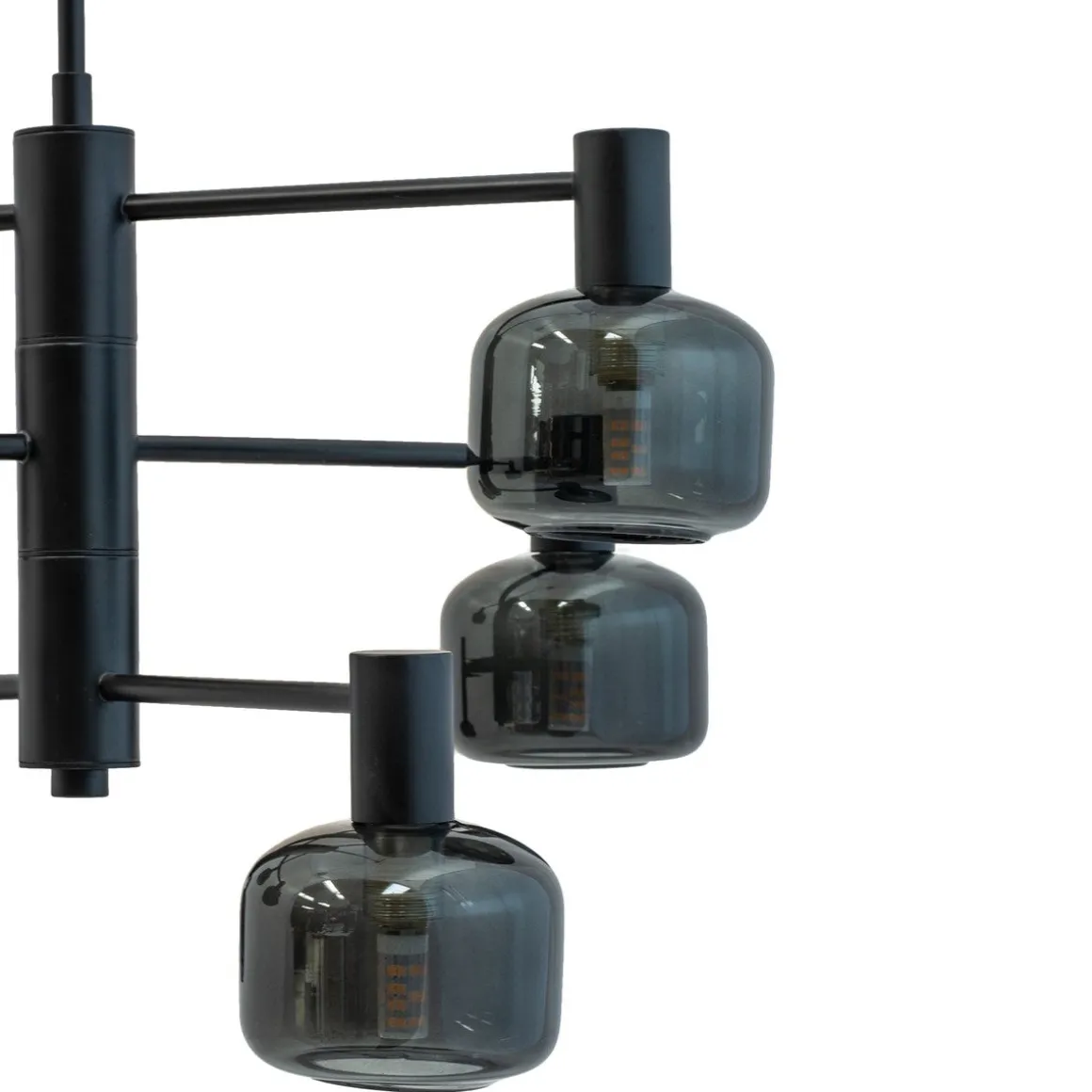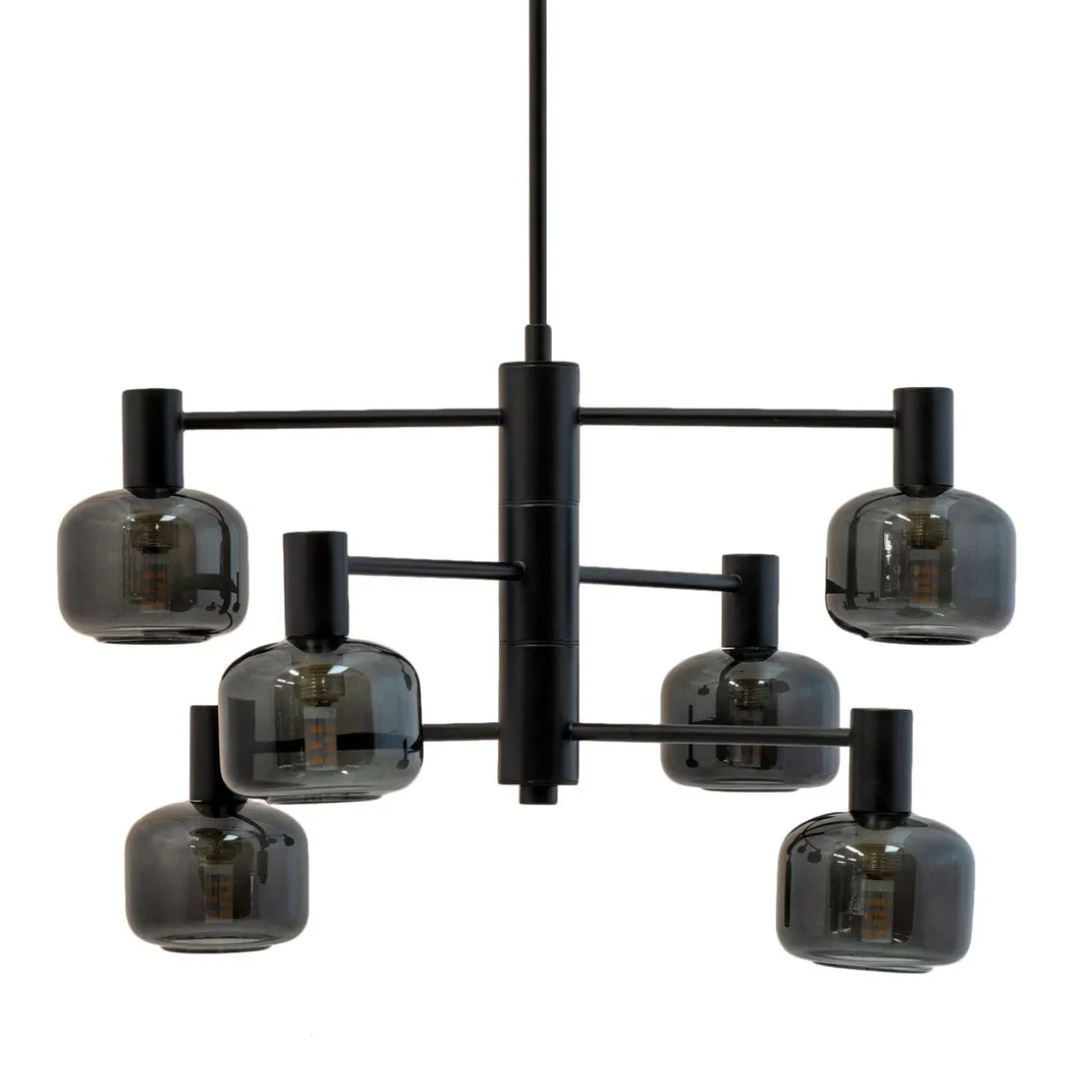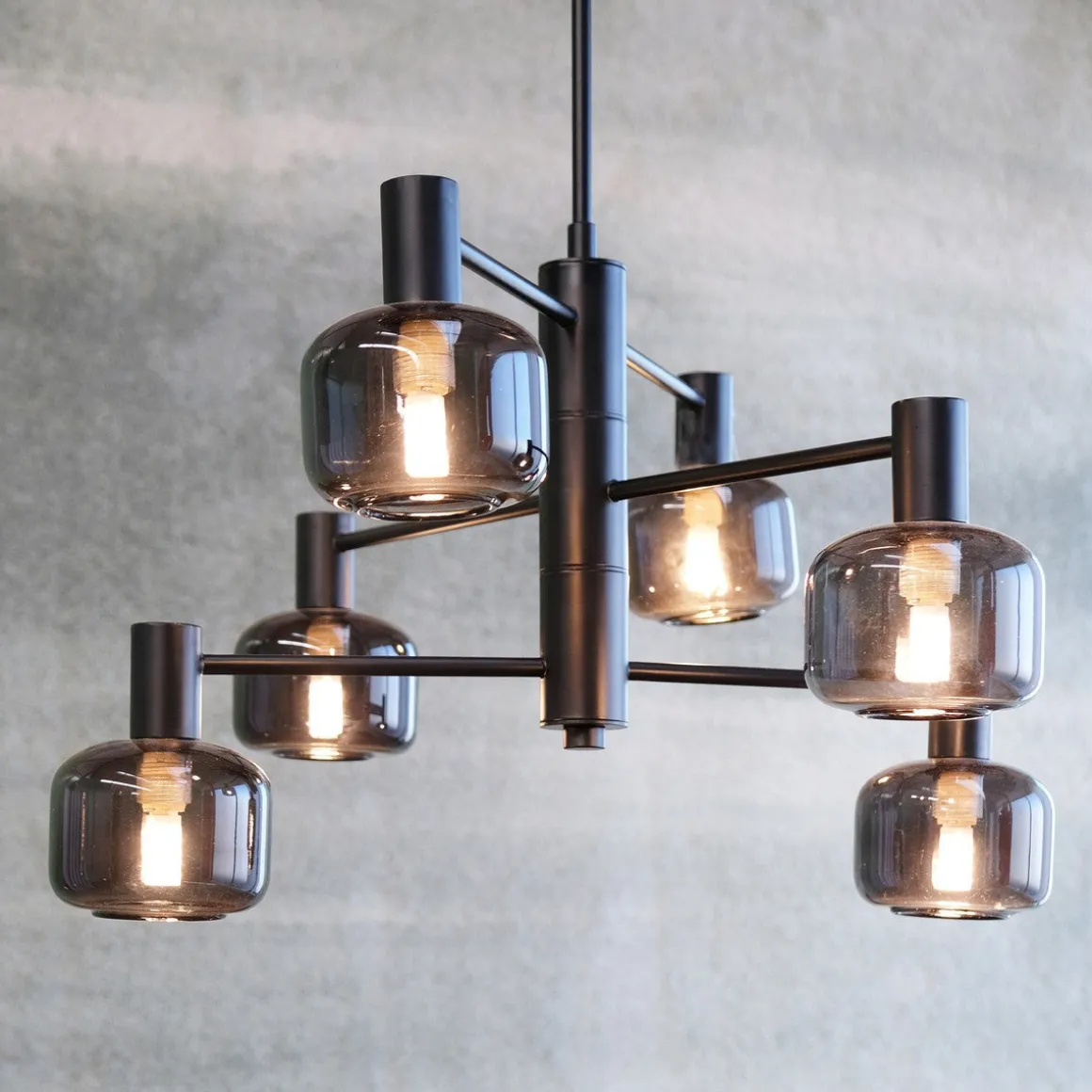Oppnå den perfekte balansen mellom form og funksjon med vår Arp-lysekrone, som har 6 vakre glasskupler i røkt glass og en elegant svart oppheng.