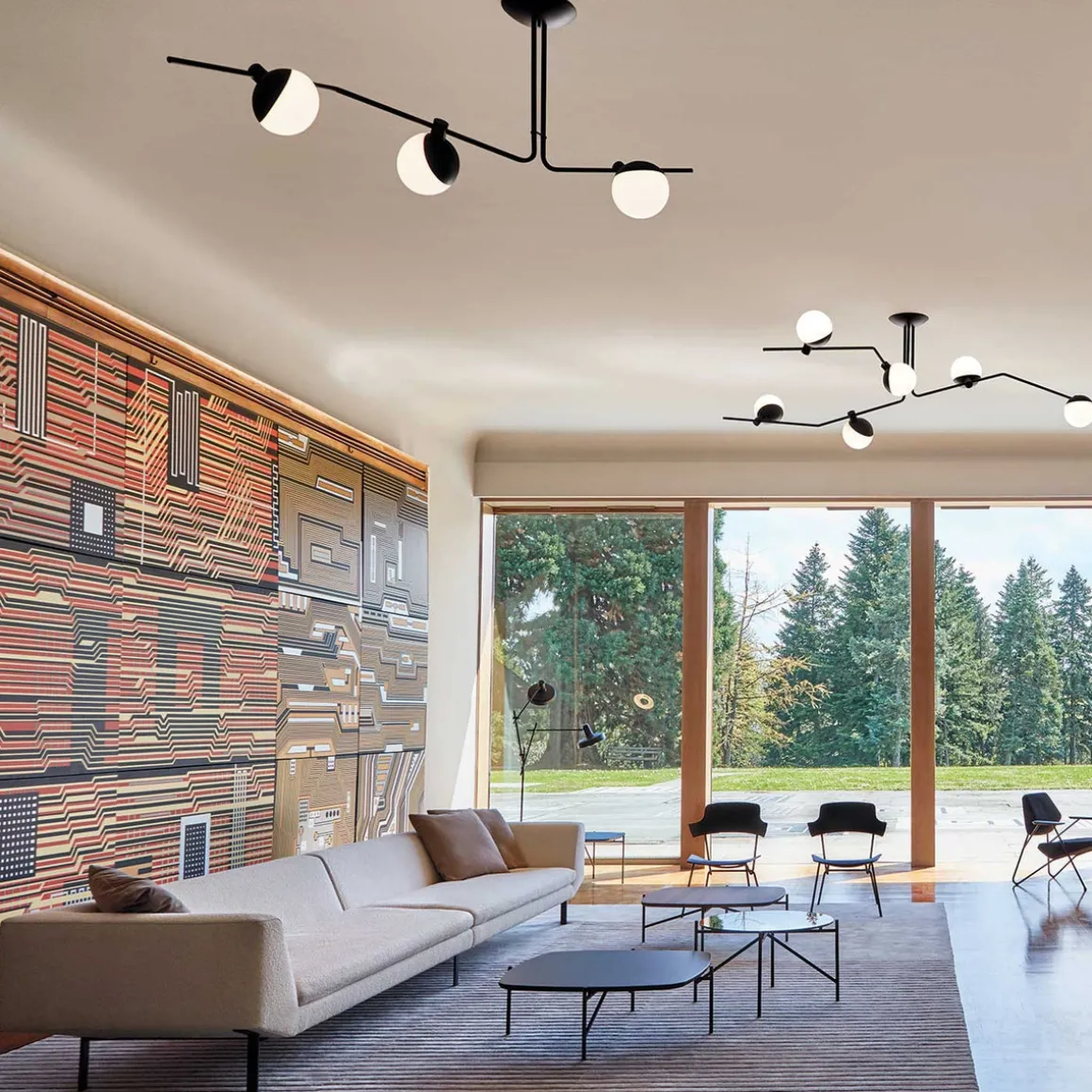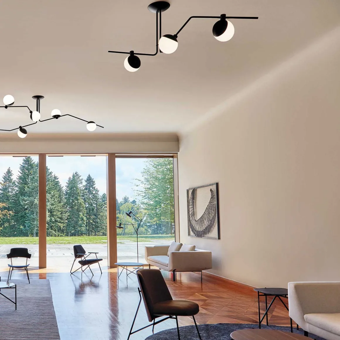 Denne moderne designer taklampen passer inn i ethvert hjem og gir stil til innredningen. Den har tre runde opalglass på de to armene og de sprer et behagelig jevnt lys i rommet.