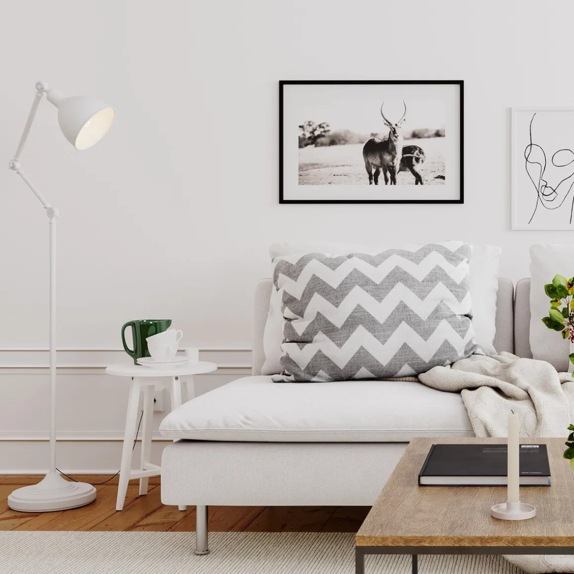 Stilig gulvlampe i hvit metall, hvorav lampehodet og ermene kan justeres.